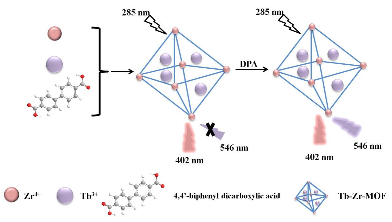 为了攻克上述问题,肖得力、Dramou Pierre团队创新性地设计了一种基于双金属有机框架(Tb-Zr-MOF)的比率荧光传感器用于炭疽生物标志物DPA的检测。研究首次通过一锅溶剂热法制备了以4, 4'-联苯二甲酸为配体,以镧系金属离子Tb3+和过渡金属离子Zr4+为金属中心的双金属有机骨架Tb-Zr-MOF,制备简便。实验表明,Tb-Zr-MOF在5–100 μM范围内对DPA有良好的线性响应,检测限低至1.72 μM,回收率达98.80%–104.8%,灵敏度高,且抗干扰能力强。此外,开发的Tb-Zr-MOF传感器成功用于检测中药紫荆皮样品中的DPA,证明了Tb-Zr-MOF的实际应用潜能。本研究提出的分析策略有望为中药材中炭疽杆菌生物标志物的测定提供全新的思路和切实可行的解决方案。