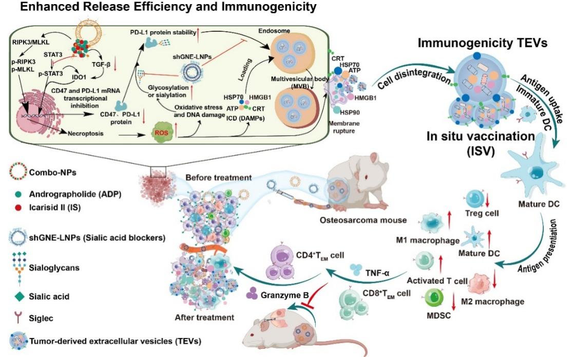 该研究首次发现两种中药活性成分可协同诱导肿瘤细胞坏死性凋亡并触发免疫原性死亡,同时通过STAT3信号通路双重调控肿瘤源性细胞外囊泡(TEVs)的蛋白货物装载。实验证实,该策略能显著降低TEVs中PD-L1和CD47等免疫检查点蛋白的载量,同时促进损伤相关分子模式(DAMPs)的富集,将免疫增效型TEVs的释放效率提升至56.44%。动物实验表明,联合糖免疫检查点抑制剂可显著增加肿瘤微环境中CD44+CD8+ T细胞浸润,成功将"冷肿瘤"转化为"热肿瘤",使骨肉瘤和乳腺癌模型小鼠生存期延长1倍以上。