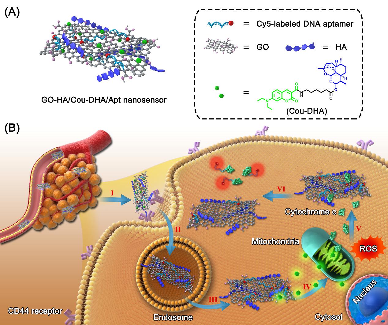 纳米传感器GO–HA/Cou–DHA/Apt组装及药效自检测作用机制