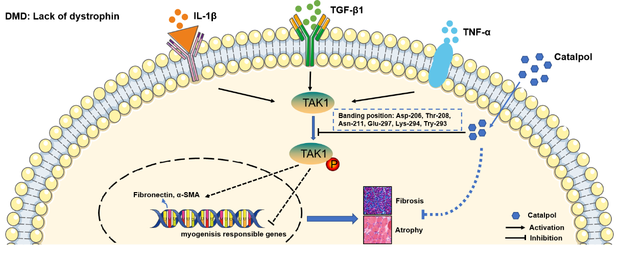 Duchenne muscular dystrophy(DMD,杜氏肌营养不良症),是一种严重的遗传性肌肉疾病。发病率在男婴中高达1/3500,患儿通常在10-12岁逐渐丧失行走能力,20-30岁因心肺功能衰竭而死亡。DMD是一种罕见病,尚未有效药物进行治疗。该研究首次报道梓醇具有治疗DMD的作用。在DMD基因缺失小鼠上,梓醇能明显改善骨骼肌纤维化,促进骨骼肌再生,提高骨骼肌功能。在DMD患者的原代成肌细胞上,梓醇能够抑制TAK1介导的成肌细胞向肌成纤维细胞转型。进一步机制研究发现,梓醇结合到TAK1 蛋白的 Asp-206, Thr-208, Asn-211, Glu-297, Lys-294, Tyr-293 氨基酸位点,阻碍了TAK1(Thr-187)的磷酸化,从而抑制成肌细胞向肌成纤维细胞转型。该研究为梓醇治疗DMD提供了临床前的研究基础,揭示了TAK1可能成为治疗DMD的药物靶点。