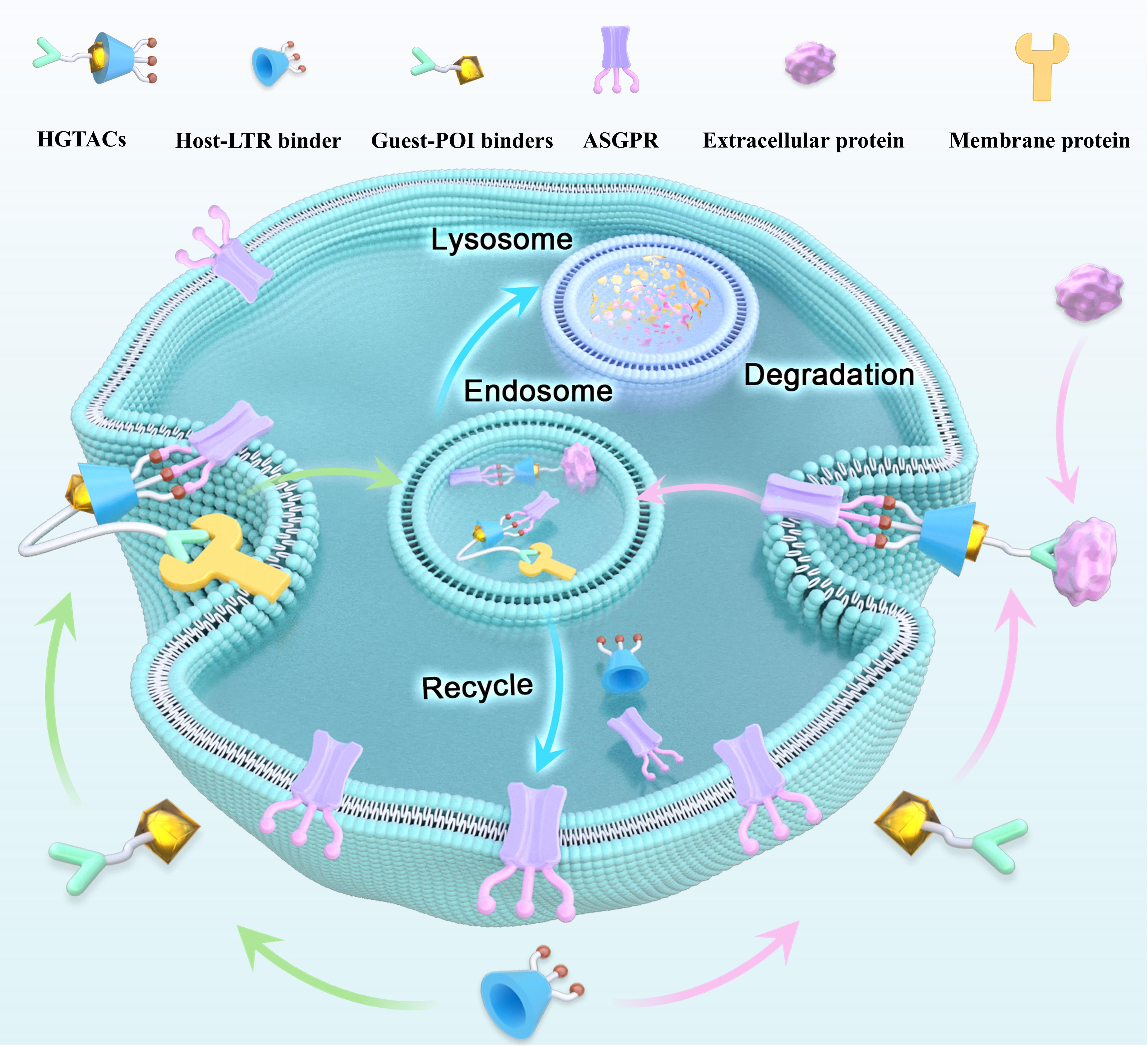 该研究提出了一种模块化、可逆、可调控的新型蛋白降解策略,成功突破了传统LYTAC共价连接构型的设计瓶颈,为靶向降解胞外与膜蛋白提供了更具灵活性的新范式,对拓展主客体化学在药物开发中的应用具有重要意义。
