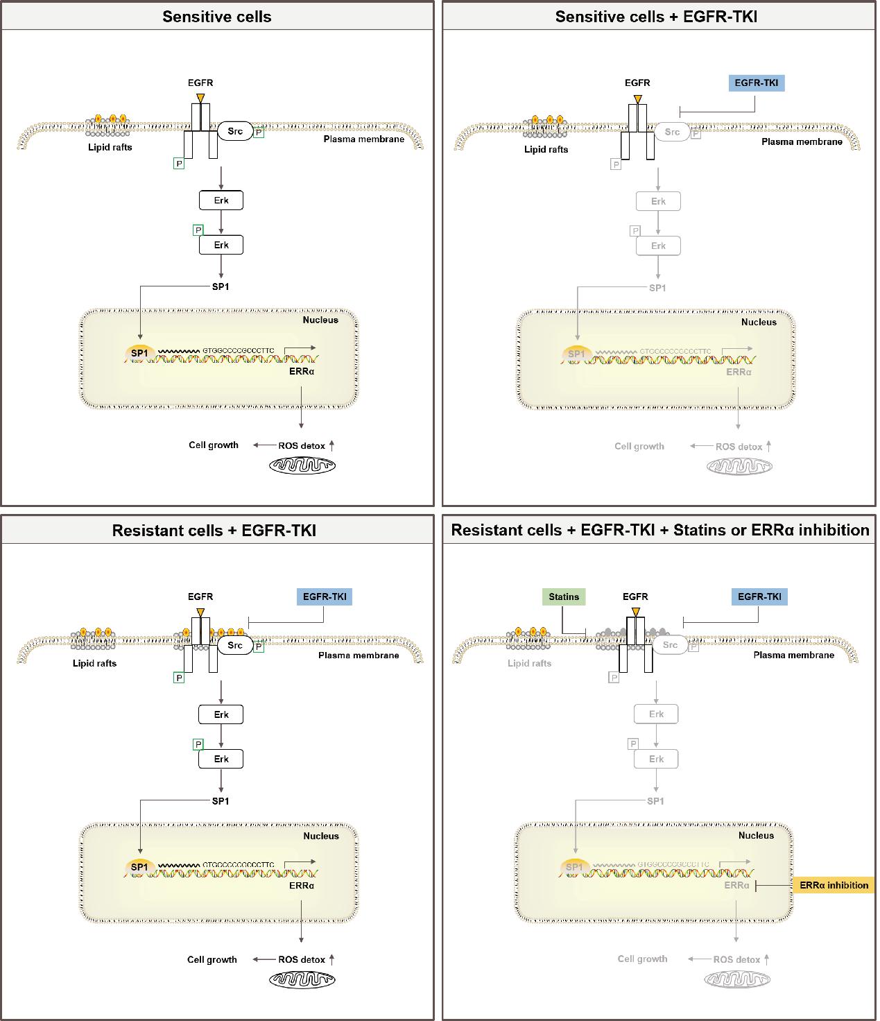研究发现,胆固醇水平升高是存在于吉非替尼和奥希替尼耐药细胞的普遍现象,并且升高的胆固醇在脂质筏累积,能够通过激活EGFR/ Src/Erk信号轴介导转录因子SP1发生核转位,SP1直接与雌激素相关受体α(ERRα)启动子结合,使其在EGFR-TKIs存在的情况下发生转录,进而产生EGFR-TKIs的获得性耐药。该研究结果表明胆固醇/EGFR/Src/Erk/SP1轴介导的ERRα表达促进了EGFR-TKIs耐药癌细胞的存活。此外,该研究还证明了降低胆固醇和下调 ERRα 有望成为 NSCLC 的有效辅助治疗手段。