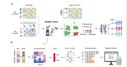 急性髓系白血病(AML)是一种起源于骨髓造血干细胞的恶性克隆性疾病,患者对现有治疗方案的反应差异巨大,亟需针对病人个体差异来制定精准的用药方案。然而,肿瘤细胞的异质性使得寻找可靠的预测性生物标志物异常困难。传统的基于bulk RNA-Seq和体外实验的模型,往往难以捕捉隐藏在治疗反应和耐药性背后的复杂分子通路与基因网络。为此,研究团队开发了名为 NetAML 的网络驱动精准药物敏感性预测平台。这项研究主要有以下关键发现: