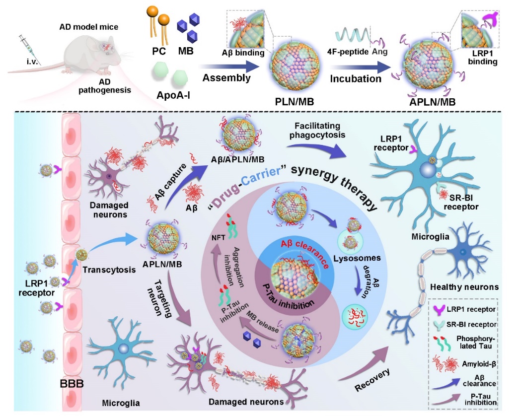 针对AD病变的两大关键诱因:β淀粉样蛋白(Aβ)沉积和Tau蛋白过度磷酸化,该团队以天然高密度脂蛋白活性组分载脂蛋白A-I和磷脂仿生组装Aβ高亲和纳米复合物,并荷载Tau蛋白磷酸化抑制剂亚甲蓝;为高效渗透入脑,经模拟肽仿生锚定并优化靶向配体密度,构建“药物-载体”协同治疗组装体;在AD病灶,载体捕获Aβ入小胶质细胞高效清除;药物借助载体实现神经元胞内富集,抑制Tau磷酸化和聚集,实现针对Aβ和Tau双病理的“药物-载体”协同治疗(图3)。相关成果以题为““Drug-Carrier” Synergy Therapy for Amyloid-β Clearance and Inhibition of Tau Phosphorylation via Biomimetic Lipid Nanocomposite Assembly”发表于Advanced Science(全文链接:https://doi.org/10.1002/advs.202106072)。2020级博士研究生韩国臣和2021级硕士研究生白凯文为本文共同第一作者,我校周建平教授、丁杨副教授、张华清博士后为本文共同通讯作者,世界杯直播为本文的唯一通讯单位。