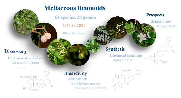 孔令义教授团队致力于中药和天然药物中结构新颖的活性化合物的发现和研究,已发现新化合物2000余个,34个化合物被Nat. Prod. Rep.杂志评为国际热点化合物“Hot off The Press”,其中楝科柠檬苦素是重要的研究方向之一。自2009年以来,本团队已经完成了楝科11属19种药用植物中柠檬苦素成分的研究工作,已在Org. Lett.,Acta Pharm. Sin. B, J. Nat. Prod.,J. Org. Chem., Org. Chem. Front.,Chin. Chem. Lett.,Ind. Crop. Prod., Phytomedicine, Phytochemistry, Tetrahedron 等天然产物研究领域国际权威和著名期刊发表包括12种新骨架在内的542个新柠檬苦素类化合物,约占同期全球发表新柠檬苦素分子总数的1/3。上述数据说明孔令义教授团队成为了楝科柠檬苦素研究领域国际上最活跃和知名的课题组之一,因此受Nat. Prod. Rep.杂志主编Tobias Gulder教授的邀请,撰写楝科柠檬苦素研究进展的综述。