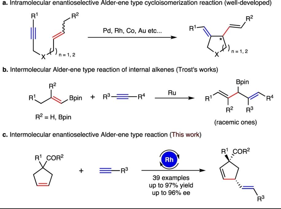 烯炔偶联反应(Alder–ene type)反应是构建碳碳键常用的且具有原子经济性和步骤经济性的合成方法之一,已被广泛应用于天然产物及其他功能性分子合成中。然而,目前分子间不对称Alder–ene反应尚无报道(图一)。