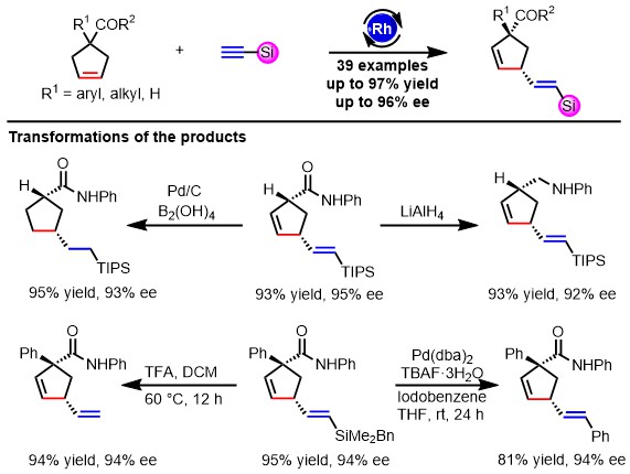 近日,国际知名期刊《自然-通讯》(Nature Communications, 影响因子 14.92)在线发表了我校姚和权/林爱俊教授团队在不对称合成领域取得的最新科研成果:Rhodium-catalyzed intermolecular enantioselective Alder–ene type reaction of cyclopentenes with silylacetylenes。2018级硕士研究生张东权为本文的第一作者,姚和权教授、林爱俊教授为本文的共同通讯作者,世界杯直播为本文的唯一通讯单位。