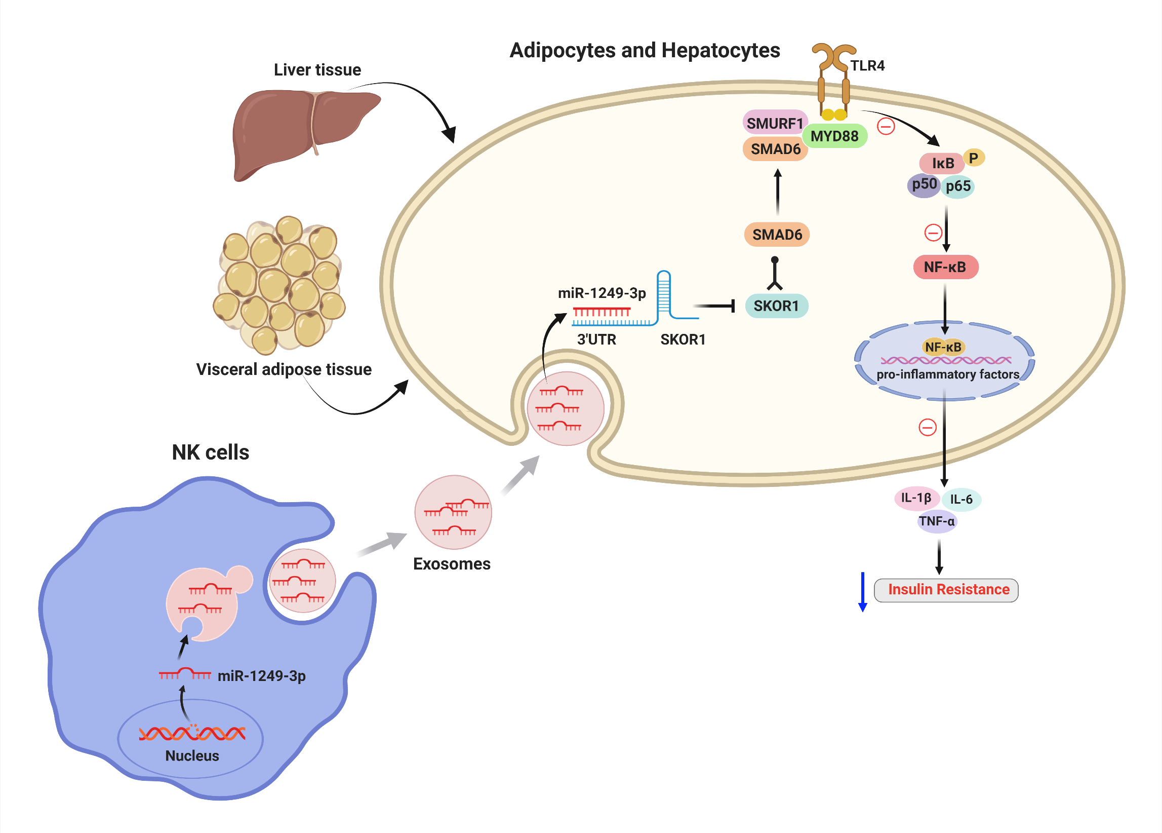 2021年11月30日,世界杯直播徐寒梅教授作为独立通讯在Signal Transduction and Targeted Therapy (IF=18.19)在线发表题为“Natural killer cell-derived exosomal miR-1249-3p attenuates insulin resistance and inflammation in mouse models of type 2 diabetes”的研究论文,并入选STTT杂志封面,副研究员王颖、博士后李梦玮为本文的共同第一作者。该研究发现来自瘦鼠的NK细胞外泌体可减轻肥胖诱导的胰岛素抵抗和炎症,进一步研究表明miR-1249-3p在瘦鼠的NK细胞中高表达,并可通过外泌体从NK细胞转运至脂肪细胞和肝细胞中,直接靶向SKOR1以调节三元复合物SMAD6/MYD88/SMURF1的形成,该复合物通过抑制TLR4/NF-κB信号通路,进而抑制炎症因子的释放,实现缓解炎症反应和胰岛素抵抗的作用。总之,该研究结果首次证明NK细胞来源的外泌体miR-1249-3p可显著提高胰岛素敏感性并减缓炎症反应。揭示了NK细胞外泌体在缓解胰岛素抵抗中的新作用,并为2型糖尿病患者的治疗提供了全新的潜在治疗靶点。