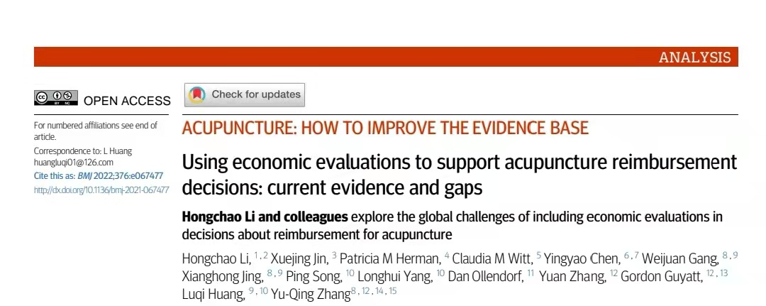 近日,我校国际医药商学院李洪超副教授以第一作者在British Medical Journal(BMJ,IF=39.89)发表分析性文章(Analysis)《通过经济学评估支持针灸纳入医保报销决策:现有证据及研究缺口》。该文章的通讯作者是中国工程院院士、中国中医科学院院长黄璐琦教授,合作者包括来自北京中医药大学、加拿大麦克马斯特大学、上海复旦大学、中国中医科学院、瑞士苏黎世大学、美国塔夫茨医疗中心以及美国RAND公司的相关学者。