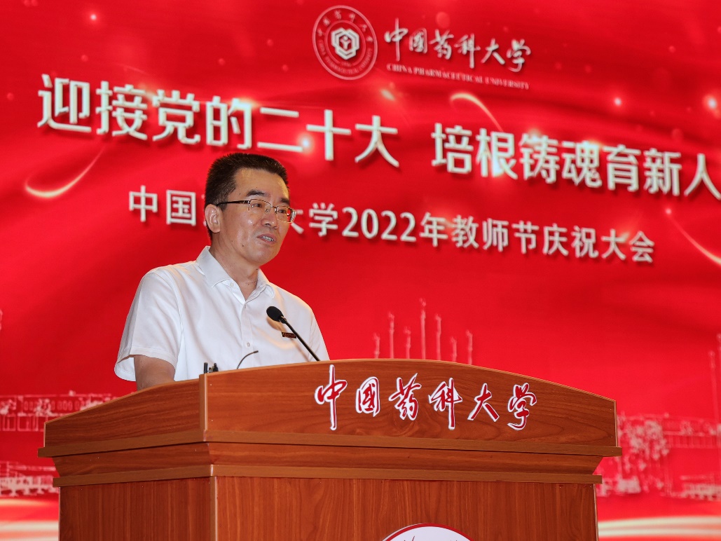 校党委书记金能明代表学校向全体教职工致以节日的问候,并向受到表彰的同志表示热烈的祝贺!他回望了过去的一年来学校在教书育人、科学研究、社会服务等方面取得的突出成绩,回顾了学校围绕教师队伍建设、教师思想政治和师德师风建设、思政教育、人才引进、实验室管理和医保改革等方面开展的一系列举措,充分肯定了全体教职员工为学校发展作出的贡献。并向广大教师提出三点希望,一是希望广大教师要做心怀“国之大者”的大先生。要从党和国家事业发展全局的高度,把立德树人融入思想道德教育、文化知识教育、社会实践教育各环节。要认真对待每一次备课、认真上好每一次课、带好每一堂实验课,培养学生成为堪当民族复兴重任的时代新人;二是希望广大教师要做改革发展创新的引领者。要传弘扬老一辈的光荣传统,自觉地将自身职业发展融入国家发展和学校事业发展大局中,积极探索、守正创新,用自己的真才实学为实现医药强国和服务健康中国做出新贡献;三是希望广大教师要做“经师”和“人师”的统一者。要从自身做起,在锤炼扎实学识上下功夫,在提升人格品质上下功夫,在坚定学生理想信念、厚植爱国主义情怀上下功夫,引导学生树立正确的世界观人生观和价值观, 努力成为德智体美劳全面发展的社会主义建设者和接班人。