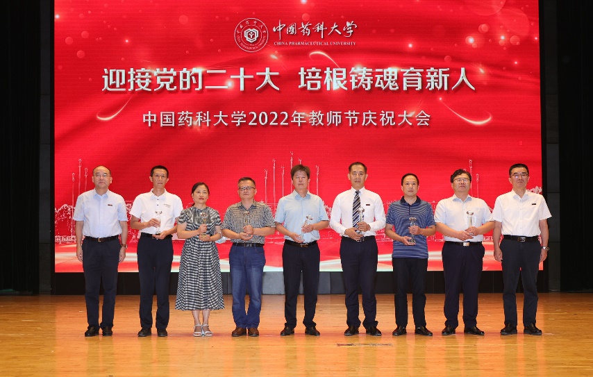 校党委书记金能明、校长来茂德为我校2021年10月至2022年9月以来退休的教职工代表和2022年度从事教育工作三十年的教职工代表颁发纪念章,感谢他们数十年如一日的默默耕耘。青年教师代表向退休教职工代表献花,展现了药大教师队伍薪火相传、蓬勃向上的精神风貌。