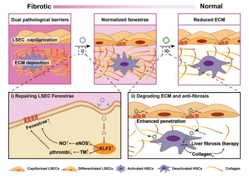 组织纤维化是由于器官受损引发过度自愈反应,是组织内细胞外基质异常增多和过度沉积的病理过程。纤维结缔组织增生会导致实质细胞减少,持续进展可导致器官结构坏死和功能减退,乃至衰竭,严重威胁人类生命健康。针对肝纤维化病理条件下毛细血管化的肝窦和沉积的细胞外基质阻碍药物蓄积、成纤维细胞过度活化的特点,该团队构建双纳米穿透剂调节肝窦内皮细胞,恢复肝窦窗孔,消融过度生成的细胞外基质并使活化的成纤维细胞转变为静息态,最终成功逆转肝纤维化病理微环境,实现有效治疗。相关研究以Sequential nano-penetratorsof capillarized liver sinusoids and extracellular matrix barriers for liver fibrosis therapy为题发表在ACSNano上。我校硕士生张凌烽、王兴欢及硕士毕业生张程璐为共同第一作者,世界杯直播为本文的第一通讯单位。(全文链接:https://pubs.acs.org/doi/10.1021/acsnano.2c03858)