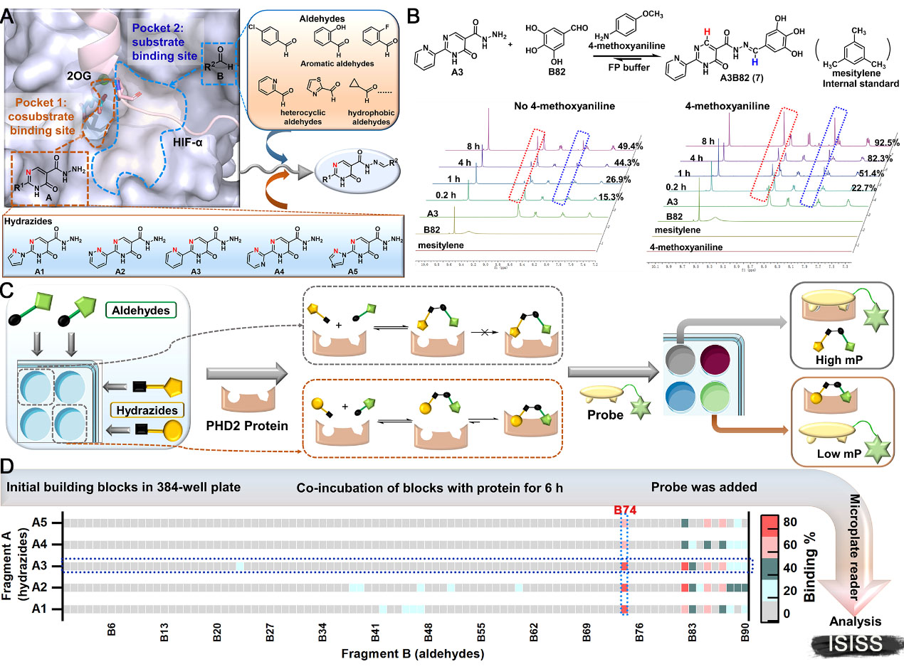 本论文研究将ISISS技术成功应用于细胞氧感受器——脯氨酰羟化酶的小分子抑制剂的药物发现中。基于靶标结构特征,以“酰肼+醛→酰腙”的生物正交反应为基础,利用酰肼片段A(5个)和醛片段B(102个,为商业化起始原料),经过两轮ISISS筛选与优化,快速获得高活性候选分子A2B101(Ki = 27 nM),体内研究表明其口服抗贫血药效与上市药物罗沙司他相当。 ISISS技术对其他靶向抑制剂的研发具有广泛适用性,可减少新药研发早期先导物发现与优化过程的研发投入,大幅度降低时间成本,助力靶向小分子创新药物研发。
