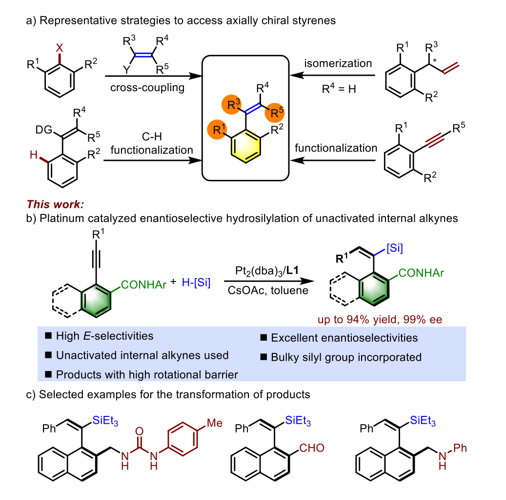 近日,国际著名期刊Angewandte Chemie International Edition(IF:16.823)在线发表了我校药学院姚和权/高尚团队题为“Atroposelective Synthesis of Axially Chiral Styrenes by Platinum-Catalyzed Stereoselective Hydrosilylation of Internal Alkynes”最新科研成果。药学院2022级博士研究生吴启民为本论文的第一作者,姚和权教授和高尚特聘副研究员为本文的共同通讯作者,世界杯直播为本文的唯一通讯单位。