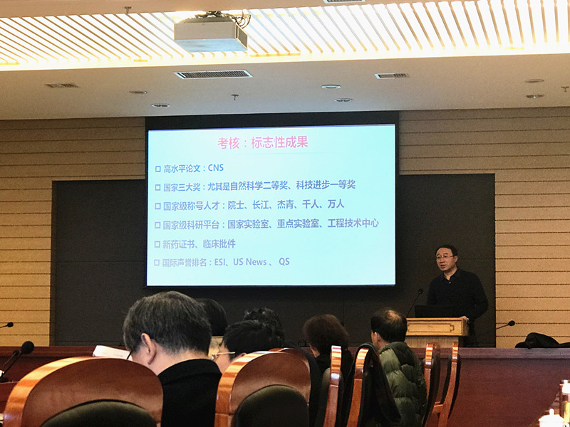 陆涛副校长首先介绍了我校在第四轮全国学科评估的总体情况,对照分项指标详细剖析药学和中药学学科的优势与不足。在此基础上提出,两个学科需进一步发扬优势、弥补劣势,为下一轮学科评估以及“双一流”建设验收打下坚实基础。随后,陆涛副校长详细介绍了我校“双一流”建设的总体目标、建设内容、年度计划以及具体实施方案,提出学校将聚焦“2+5”学科高峰和学科高原建设需求,着力打造一流公共实验平台,通过统筹建设和自主申报建设两种模式具体开展项目实施工作。