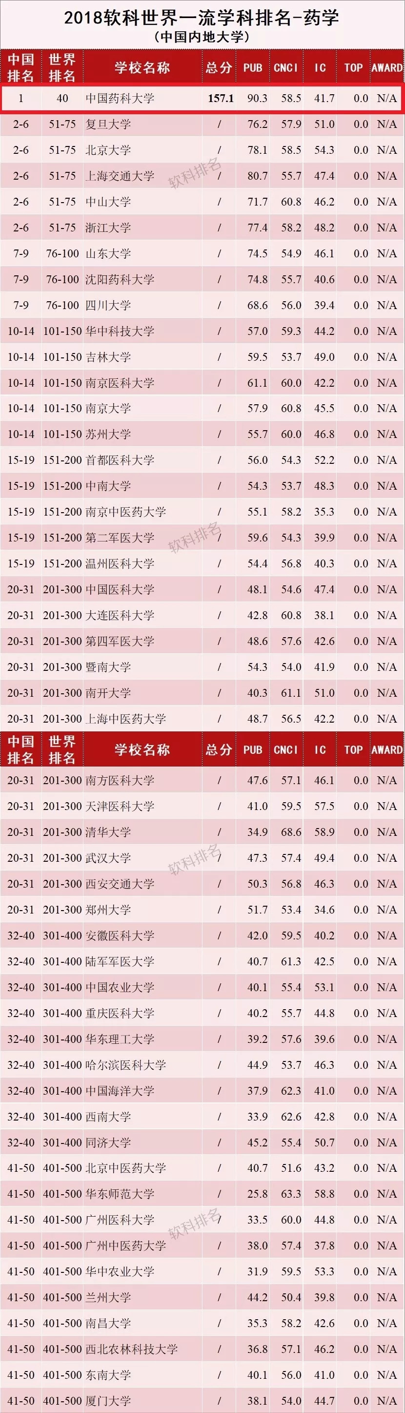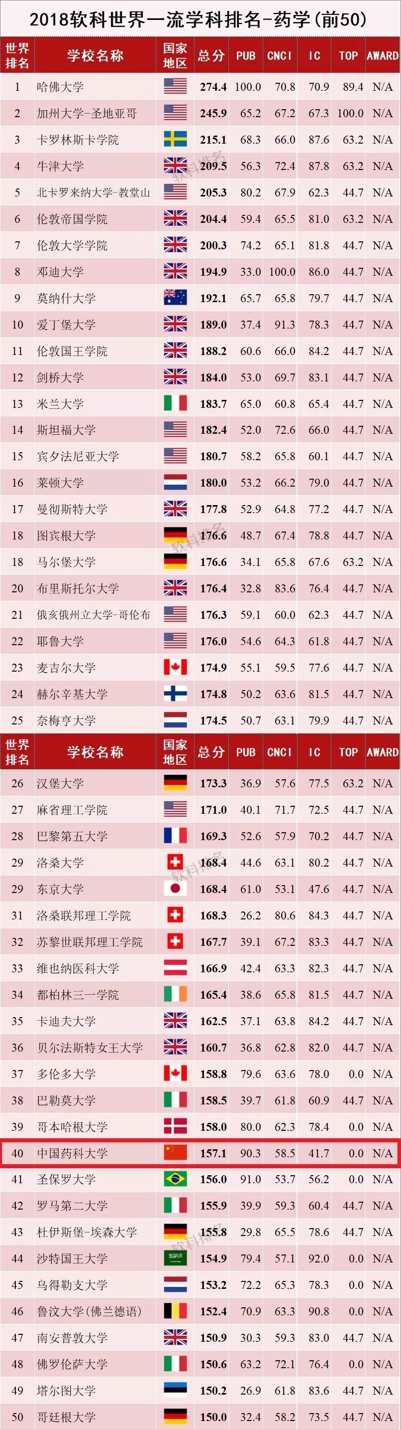 2018软科世界一流学科排名-药学(全球前50
