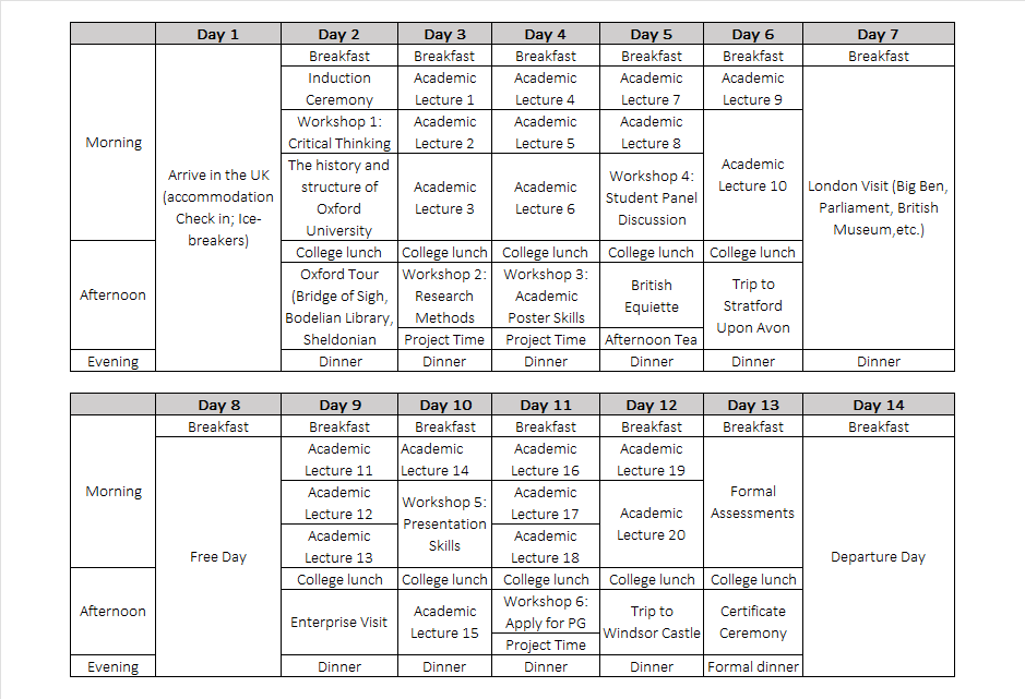 课程由:1. 跨学科学术课程; 2. 学术实践工作坊; 3. 行业特邀嘉宾讲座; 4. 英国企业参访; 5. 英式社交拓展; 6. 英伦文化体验;等六部分组成。