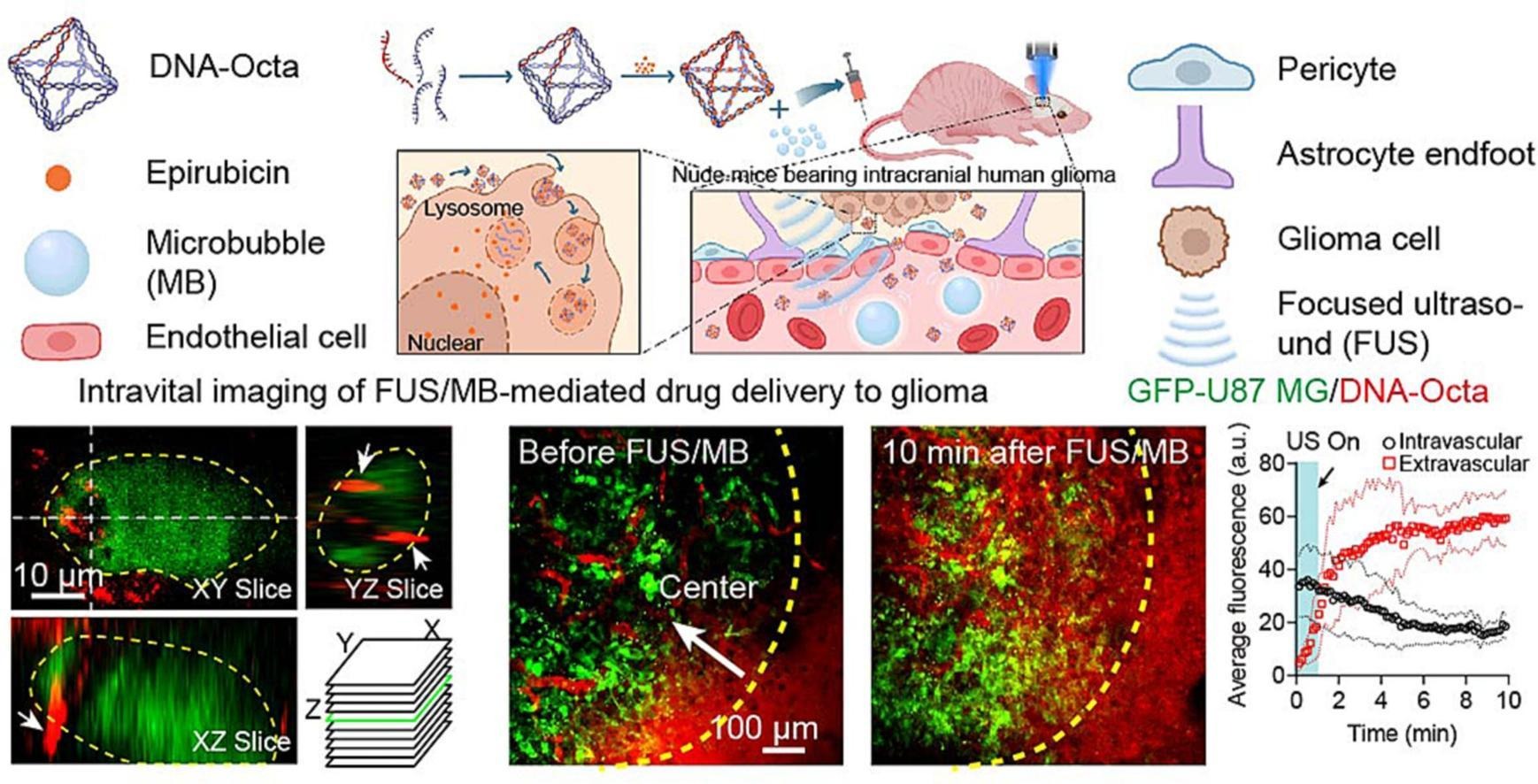 在这项研究中,研究人员设计了一种pH响应性DNA八面体,负载表柔比星(Epr@DNA-Octa),通过 FUS/MB法将其递送至颅内胶质瘤发挥治疗作用。结果表明FUS/MB法局部打开BBB或BTB,增强了Epr@DNA-Octa向大脑的递送,并在携带颅内胶质瘤异种移植物的小鼠模型中发挥良好的治疗效果,中位生存率增加50%,最大生存期增加73%。因此,该研究开发出治疗胶质瘤药物递送的替代策略,进一步推动FUS/MB法作为DNA纳米结构负载脑癌治疗药物递送平台研究,具有临床应用前景。