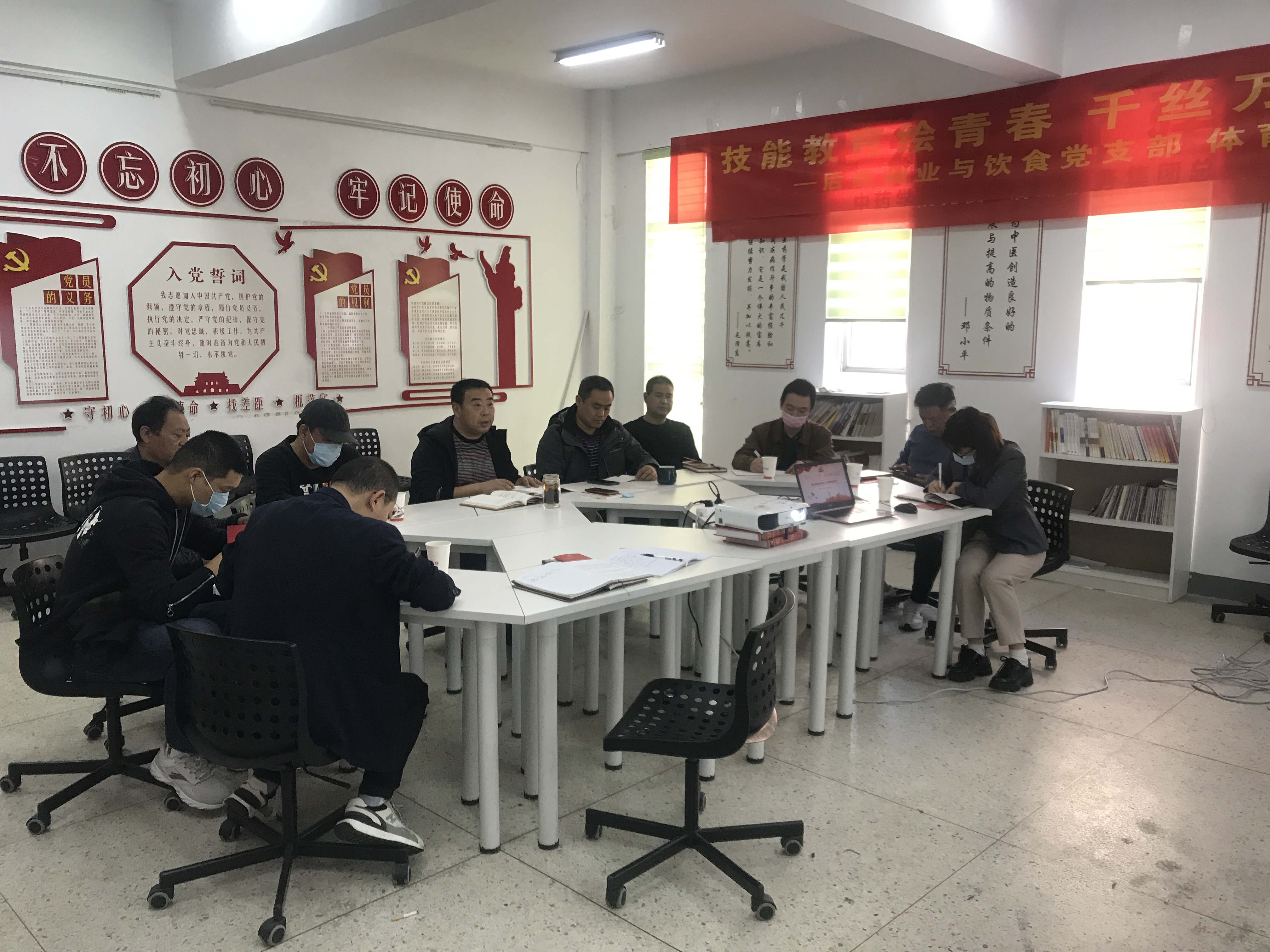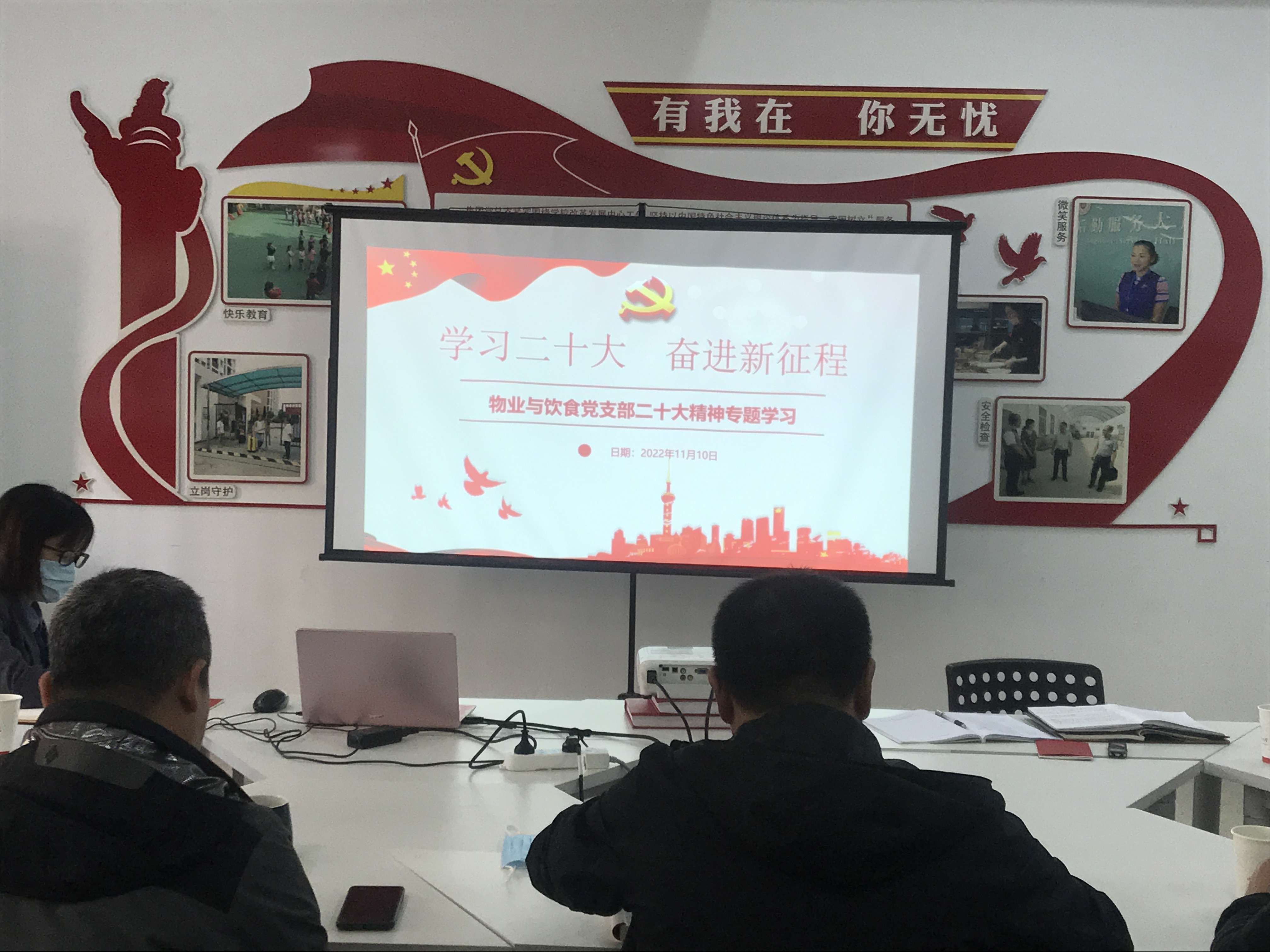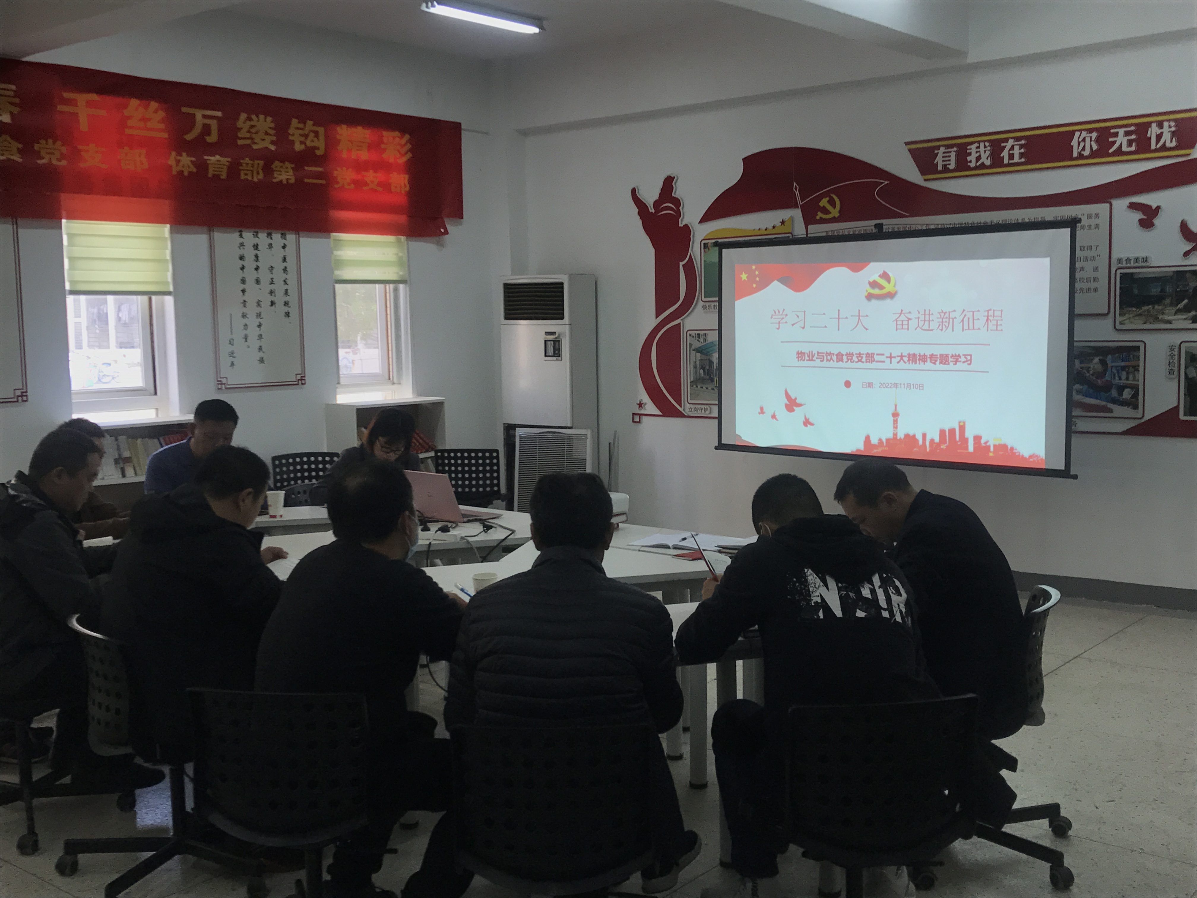 11月10日下午,物业与饮食党支部在学生公寓党建社区工作站开展了党的二十大精神专题学习,后勤集团副总经理吴振华莅临参加,支部全体党员、预备党员、积极分子参加学习,活动由支部书记刘建主持。