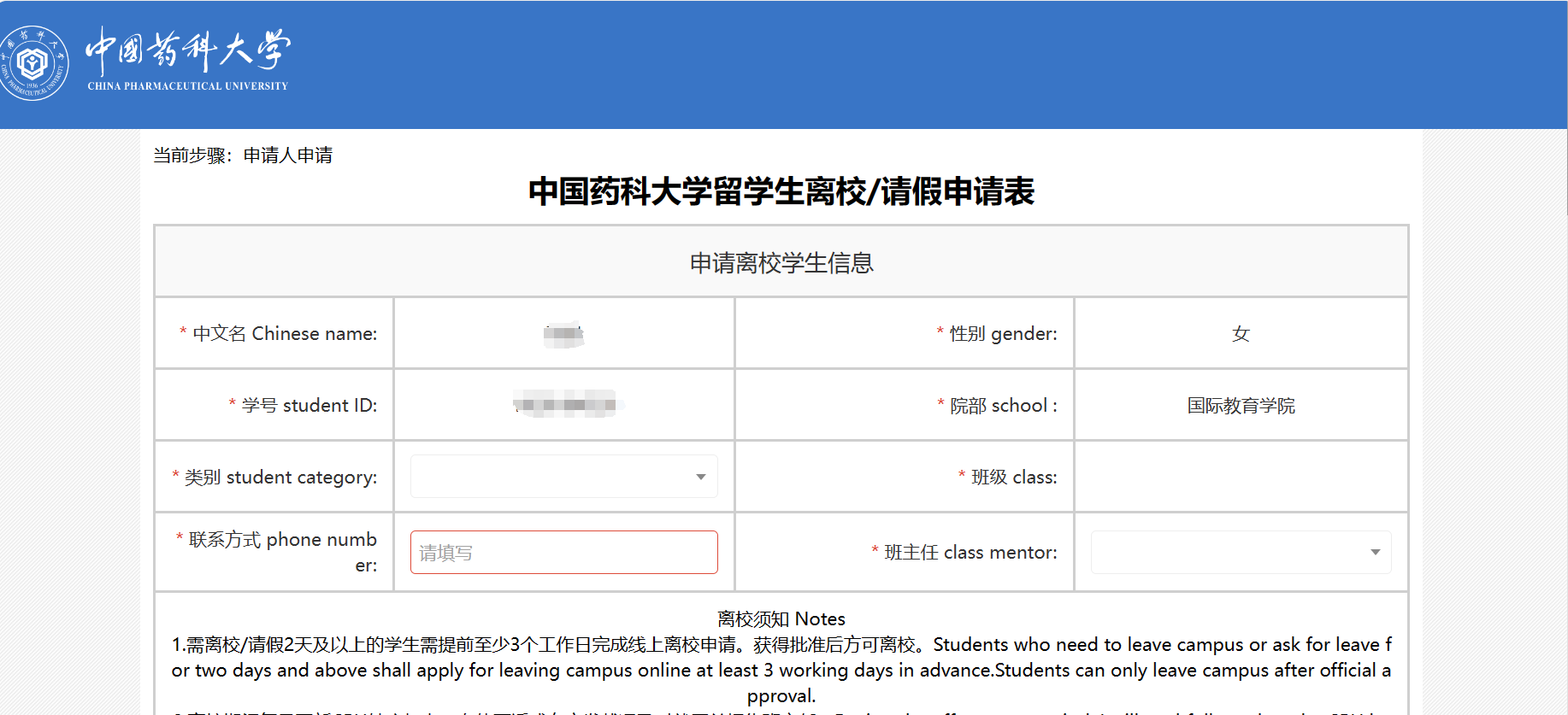(2)留学生离校、离宁须提前3天通过企业微信或者学校信息门户提交【留学生离校/请假】申请表;