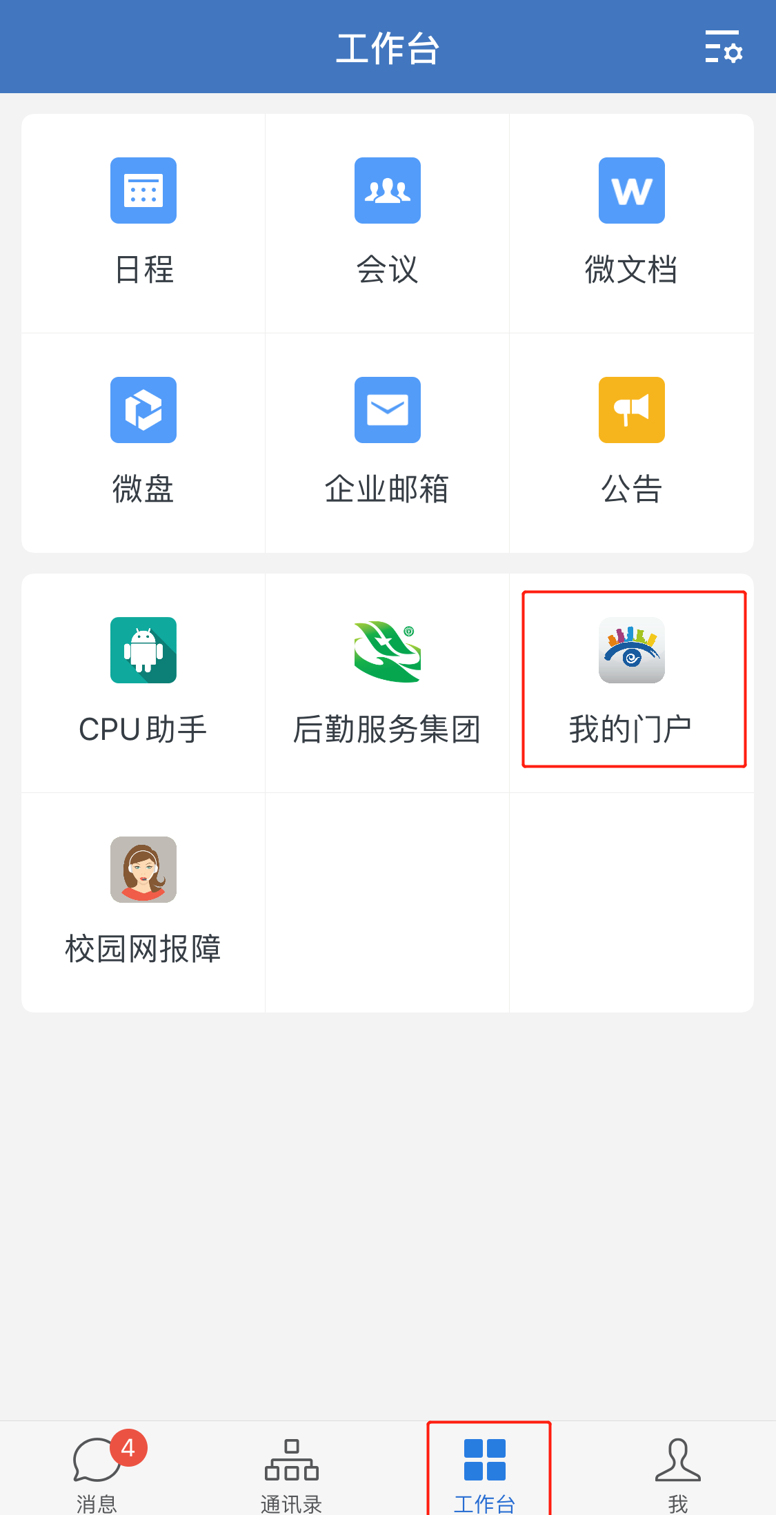 Click “workspace”and find “我的门户”, login with your Campus Net account, and there will be a message upon successful binding.