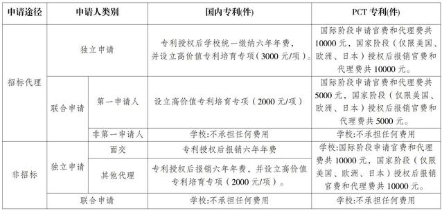 1.为鼓励高价值专利培育,促进成果转化,对职务发明专利给予支持。国内发明专利授权后,我校作为独立申请人的学校支持专利授权后6年年费,并分类别设立高价值专利培育专项。PCT专利申请国际阶段和国家阶段给予相应支持。(具体支持方案见附件2)。