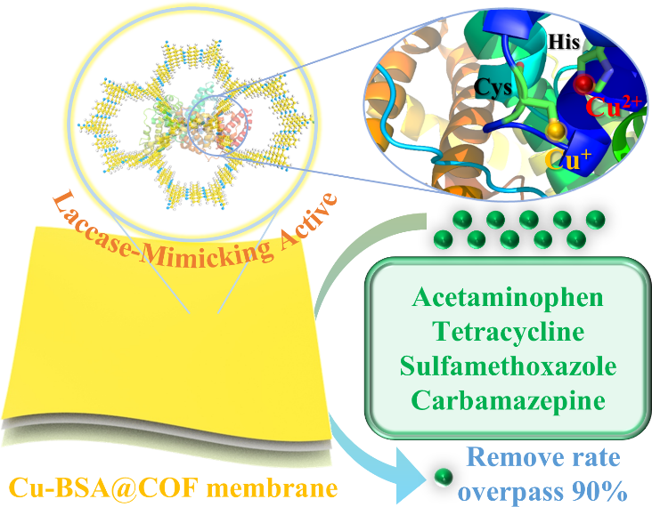 为解决上述问题,研究团队基于“原位”和“受限配位”的概念设计了一种具有显著漆酶模拟活性的无机–有机杂化共价有机框架(Cu-BSA@COF)。牛血清白蛋白(BSA)与铜(Cu)的配位结合促进了多铜活性中心的形成(图1)。COF的骨架和孔隙结构保护活性位点并增强底物吸附。它们之间的协同作用确保材料在各种恶劣操作条件下保持催化活性。研究表明Cu-BSA@COF具有和天然漆酶相接近的底物亲和力(Km)和生物催化效率(Kcat/Km)。与天然漆酶和Cu-BSA相比,其生物催化效率分别增加了18.56%和168.57%,结果表明Cu-BSA@COF是天然漆酶的理想替代品。基于上述优势,研究团队成功将其与膜技术结合,在最佳工艺和应用条件下,该膜一次过滤可去除90%以上的盐酸四环素(TC)、对乙酰氨基酚(APAP)、卡马西平(CBZ)和磺胺甲恶唑(SMZ)(环境中药物污染物的主要成分)(图2)。广泛的适用性和有效规避对环境的次生污染风险为药物污染物的去除提供了研究新范式。