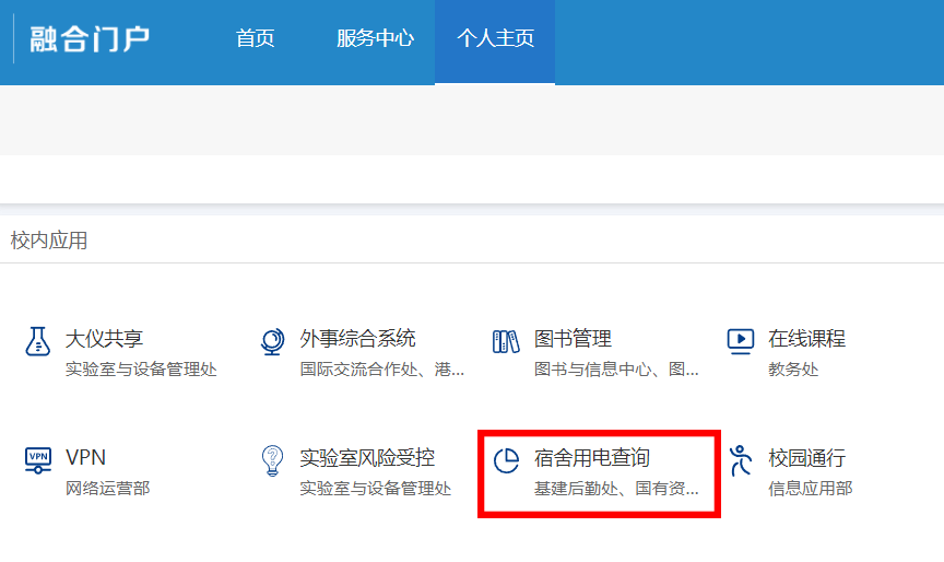 登录信息门户,在个人主页 - 宿舍用电查询,显示登录学生宿舍的剩余电量和购买记录。