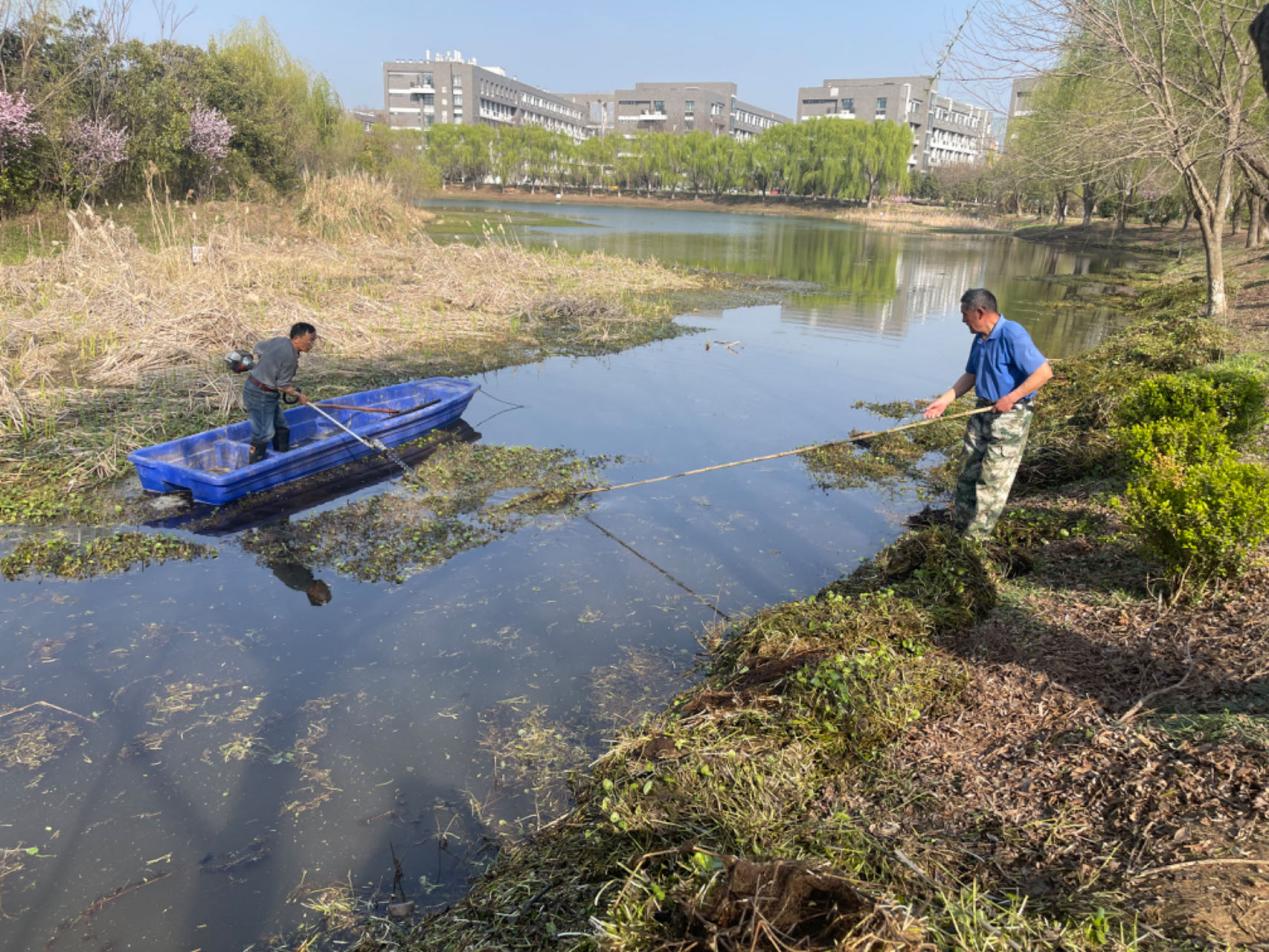 3月22日-26日,基建后勤处组织开展对江宁校区明湖湖心岛西侧水草及芦苇等进行打捞、清理活动,改善湖水水质,提升明湖及周边环境景观视觉,营造“水清、河畅、岸绿、景美”的良好校园水环境,促进学校可持续发展,共同守护健康绿色校园。