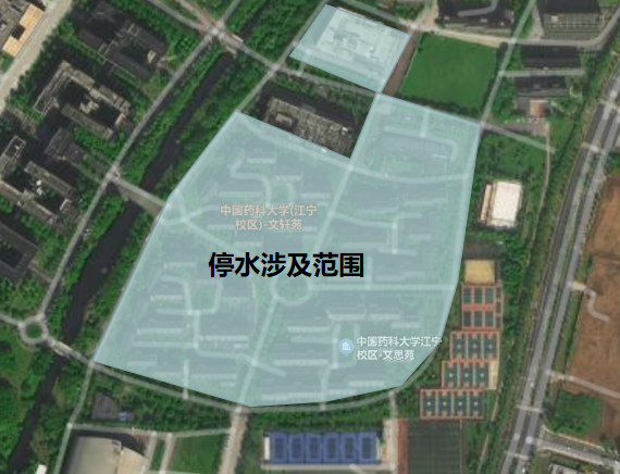 因自来水管道接驳施工,江宁校区学生公寓ABCD组团、医学楼和二食堂将短时间停水,请相关部门和人员提前做好准备(具体停水范围详见下图)。