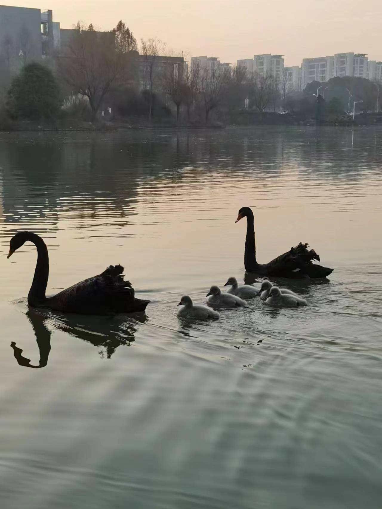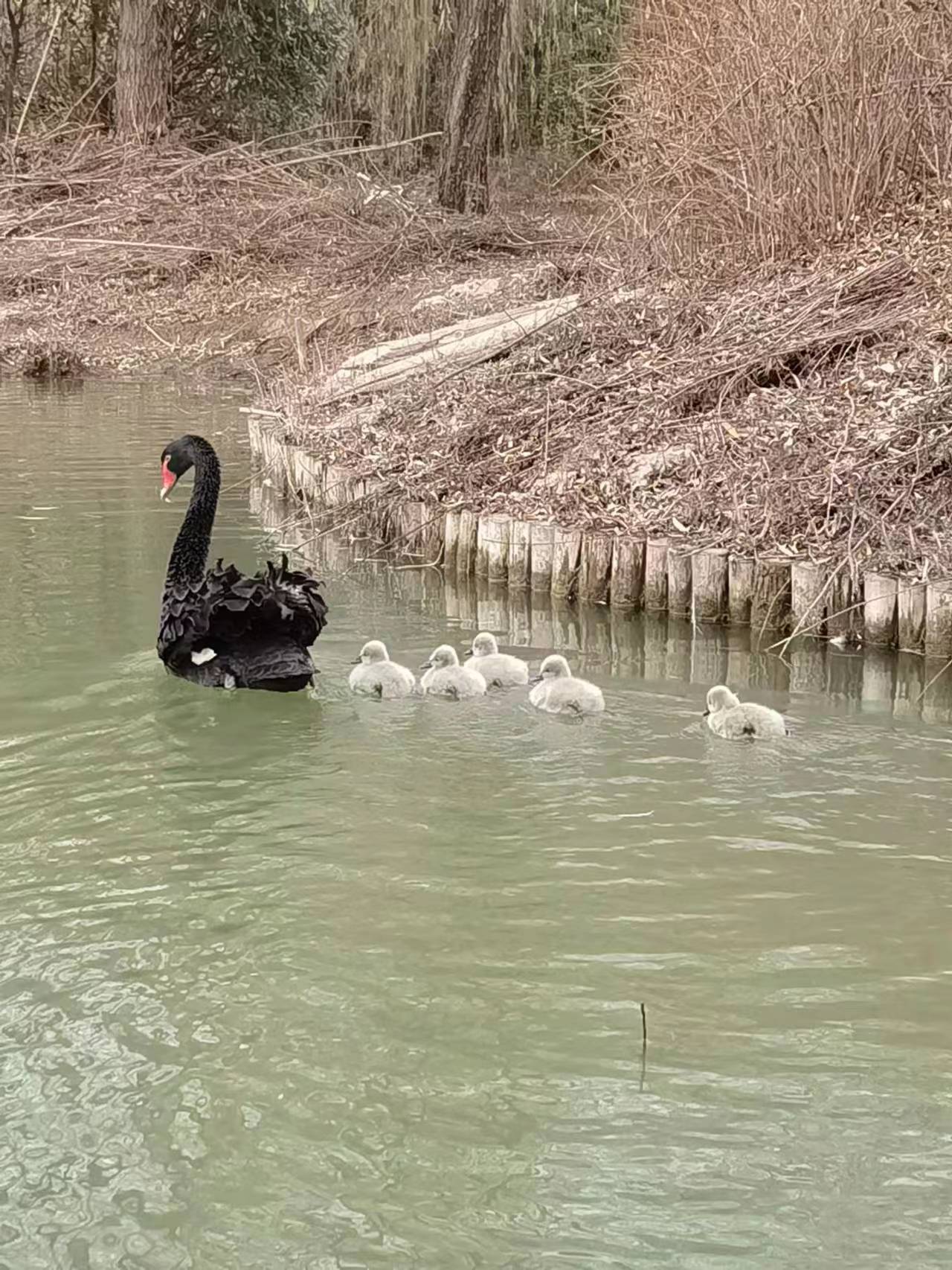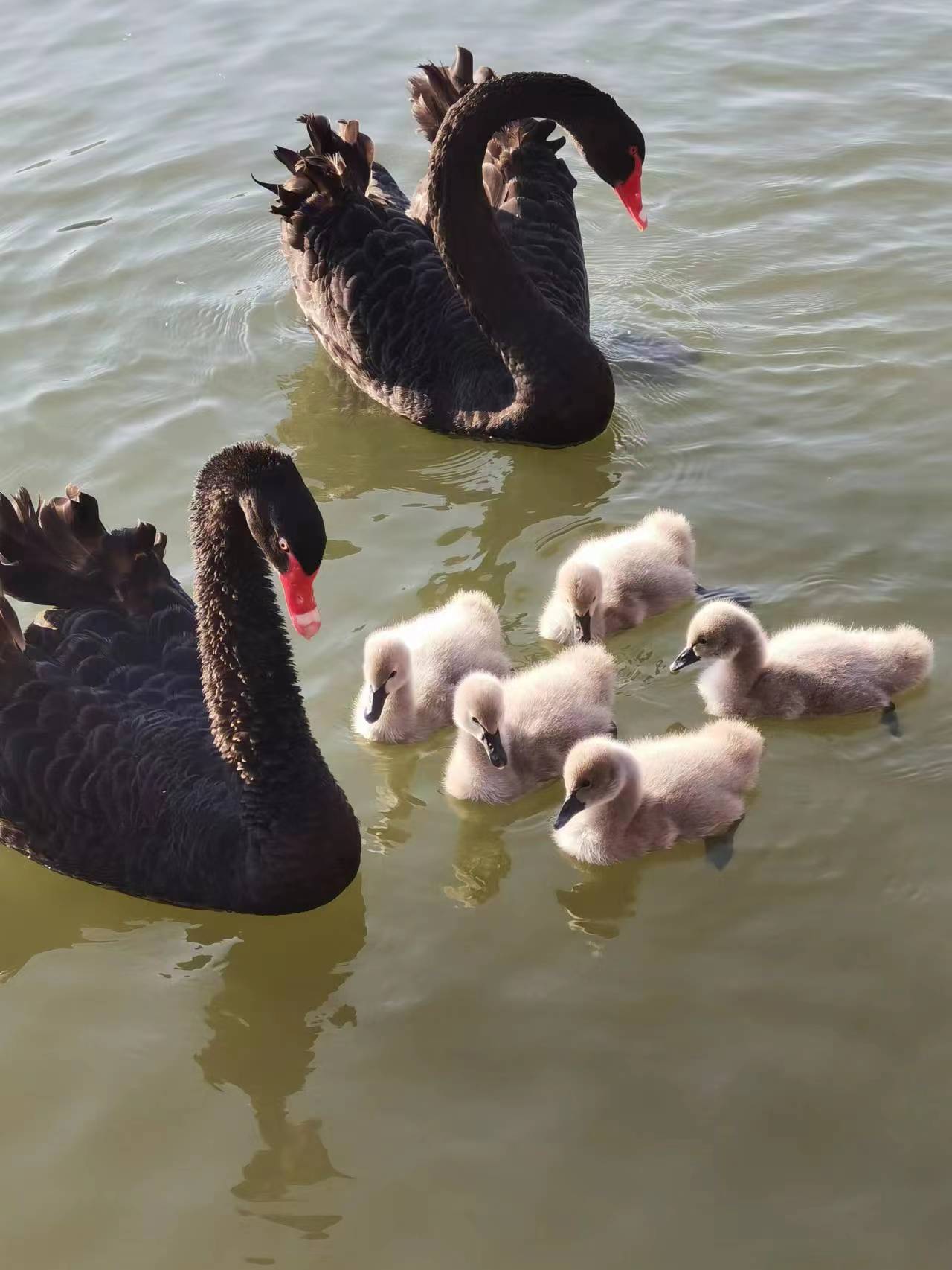冬日阳光下,五只黑天鹅宝宝在鹅爸鹅妈的呵护下嬉戏镜湖,小可爱们毛绒绒的身姿萌态十足,惹人喜爱。