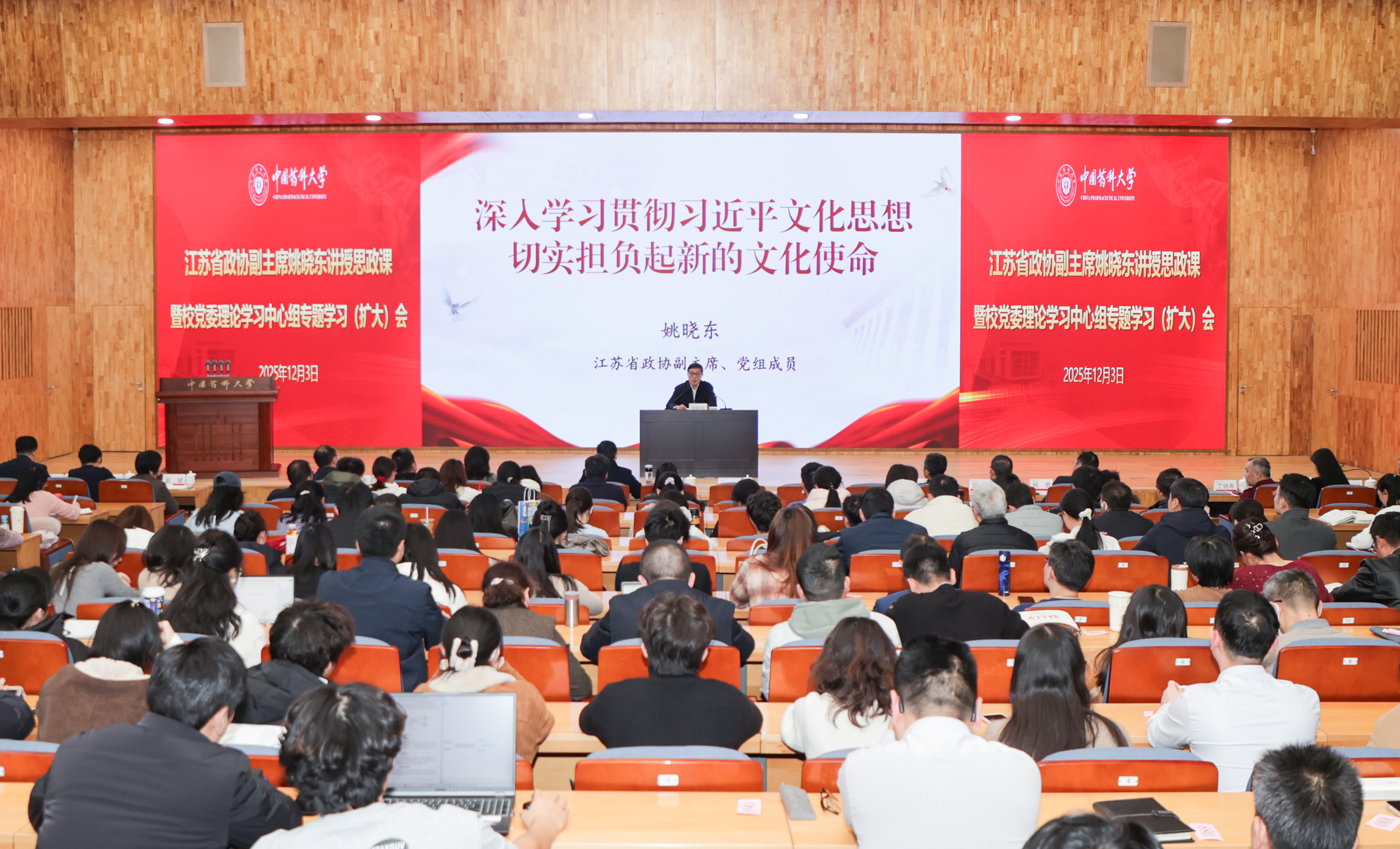 12月3日下午,我校在江宁校区会议中心二楼报告厅举行校党委理论学习中心组2025年第7次专题学习(扩大)会,会议邀请江苏省政协副主席、党组成员姚晓东为我校师生讲授思政课。全体在宁校领导、校党委理论学习中心组成员、处级以上干部、全体思政课教师、辅导员以及学生代表等参加报告会。会议由校党委书记戴建君主持。
