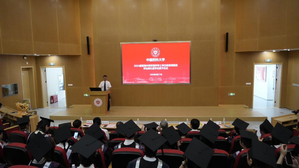 典礼在雄壮的国歌声中拉开帷幕,副校长孔令义首先致辞,向毕业生表示祝贺,同时希望他们关注与支持母校的建设与发展,在工作中继续发扬“精业济群”的校训精神,坚持终身学习,为香港地区群众提供优质的药学服务。