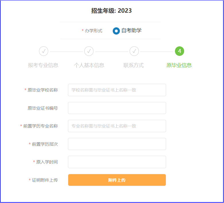 特别提醒:填写原毕业信息时,需注意下方附件说明。所有需要提交的附件如工作证明等,请一并上传在此处。