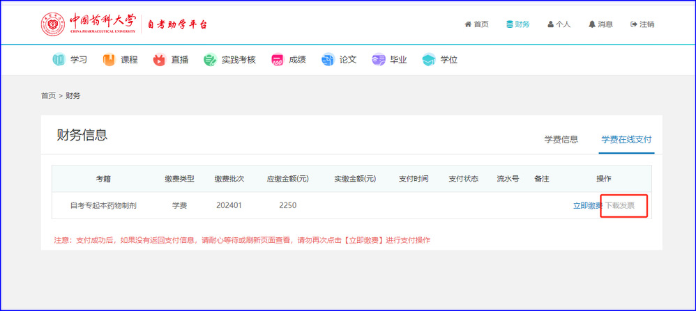 点击右上角财务,可看到学费信息,点击学费在线支付,立即缴费。