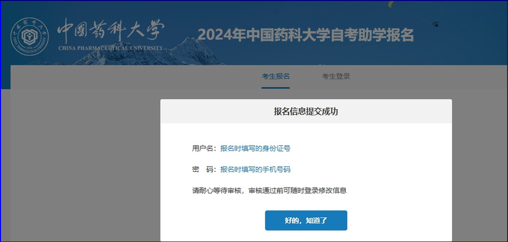 (四)学院审核通过后,下次登录在自考助学报名系统的“考生登录”页面,用户名为考生身份证号码,初始密码为考生注册时的手机号码。