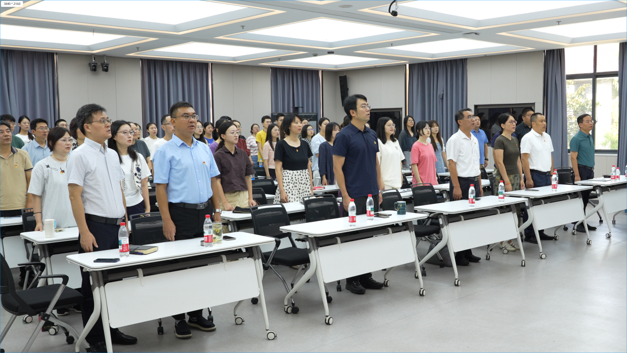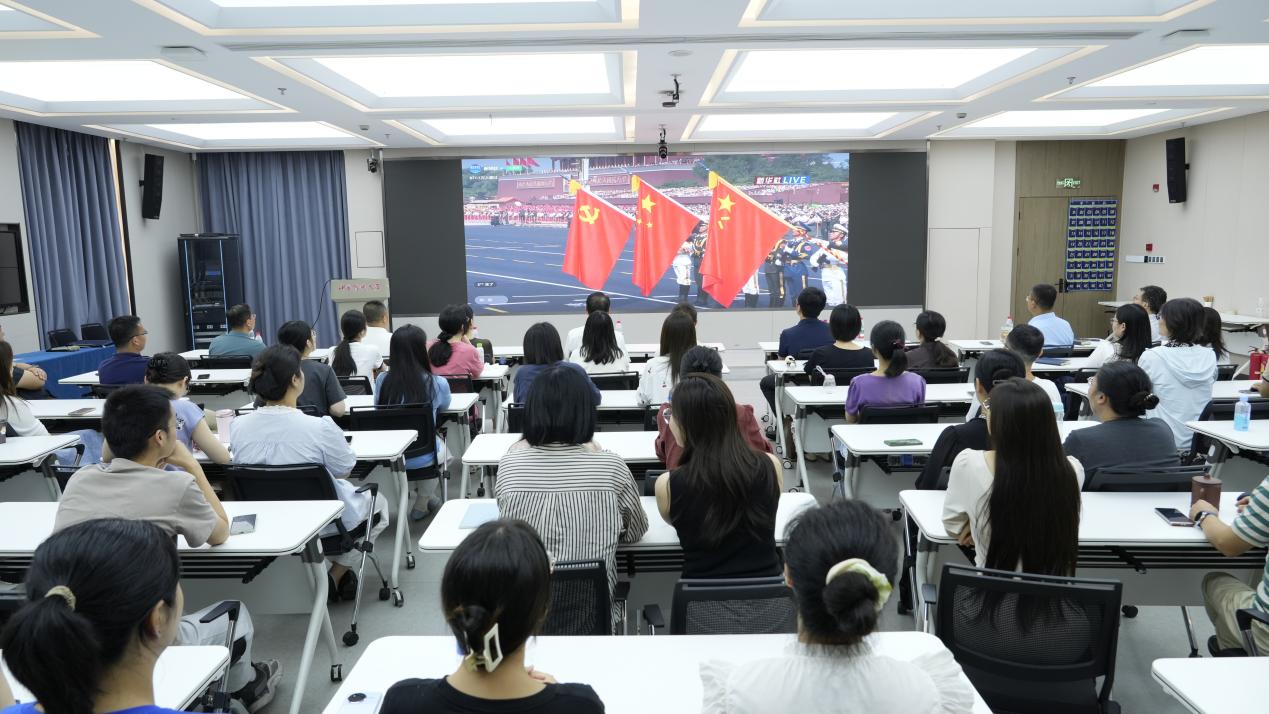 活动开始前,党员们早早来到报告厅,整齐就座,精神饱满,胸前的党员徽章熠熠生辉,现场气氛庄重而热烈。9时整,纪念活动正式开始。随着激昂的国歌声响起,全体党员起立,面向屏幕共唱国歌,向国旗行注目礼。习近平总书记的重要讲话发出了“铭记历史、缅怀先烈、珍爱和平、开创未来”的伟大号召,让在场的党员们心潮澎湃、激动万分。随后的阅兵式环节,党员们全神贯注,认真投入;当受阅部队迈着整齐有力的步伐通过天安门广场时,磅礴的气势、坚定的力量和飒爽的英姿让党员们无比震撼;而多种新型武器装备和信息技术方队的亮相更是让人感受到了无比的自豪和荣光。