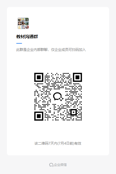 请各班指定一名联系人负责本班的教材订购和领取事宜,扫描二维码添加教材沟通群企业微信群,若在教材征订过程中遇到问题,可咨询。
