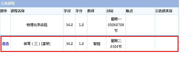 请同学们注意:如果选错了,可以及时删除错选的课程(方法是选中右边课表里的错误课程点击“退选”按钮),再改选正确的课程。在选课完成时一定要确定已选课程中有体育课再退出系统。如果误删除,过了选课阶段无法补选,后果自负。