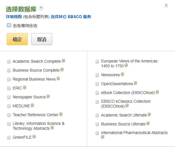 可点选“EBSCO学术检索大全(全学科)”,按需选择子数据库
