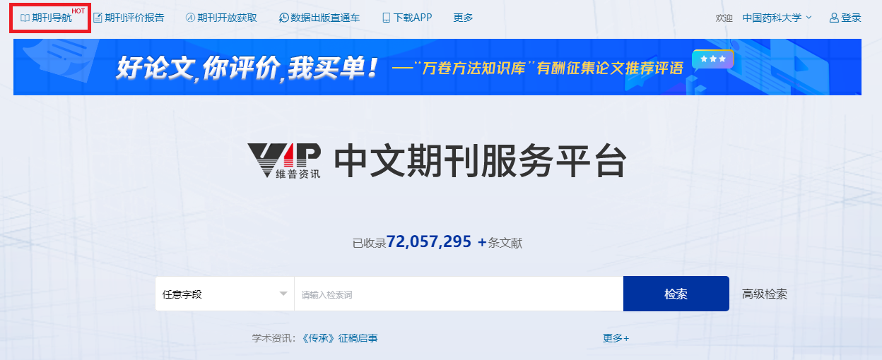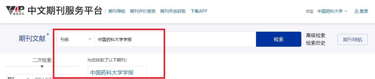 2. 《维普中文期刊服务平台》中的“期刊导航”模块,搜索所需查阅“刊名”,点选相关图标,出现收录明细。