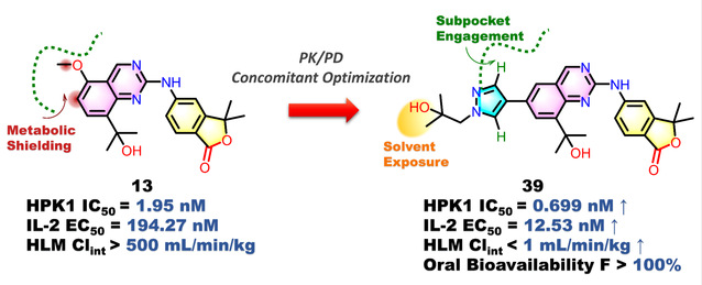 通过创新性采用结构导向的位点修饰策略,研究团队成功实现药代动力学(PK)与药效学(PD)的同步优化。所开发的候选化合物39展现出显著优势:在活性方面,其对HPK1的半数抑制浓度(IC50)达到0.70 nM超高水平;选择性方面,在83种激酶谱筛选中对90%以上非靶标激酶保持超百倍选择性;药代特性方面,其人肝微粒体代谢稳定性(CLint <1 mL/min/kg)与口服生物利用度(小鼠模型F%达119%)均突破现有技术瓶颈。