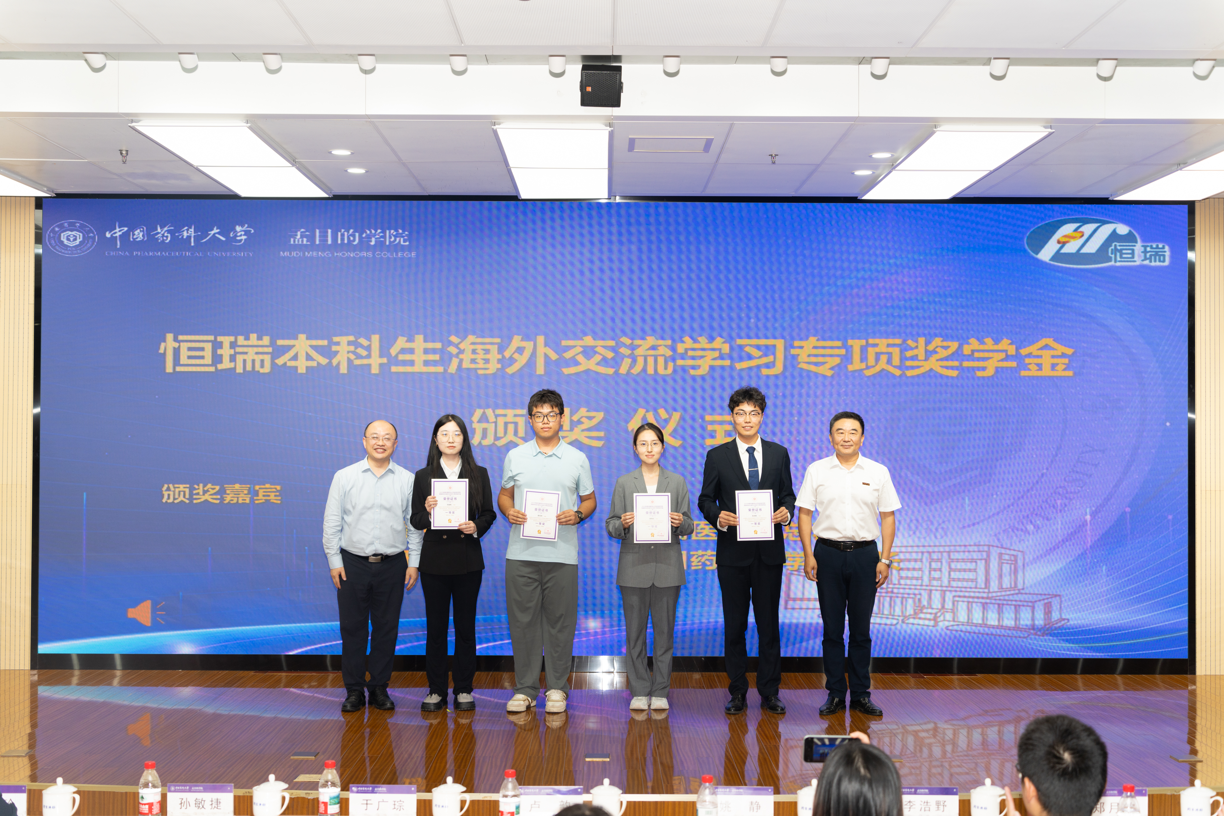 刘睿副院长宣读恒瑞本科生海外交流学习专项奖学金的表彰决定。于广琮、卢韵及校企双方领导逐一为获奖学生颁发荣誉证书。