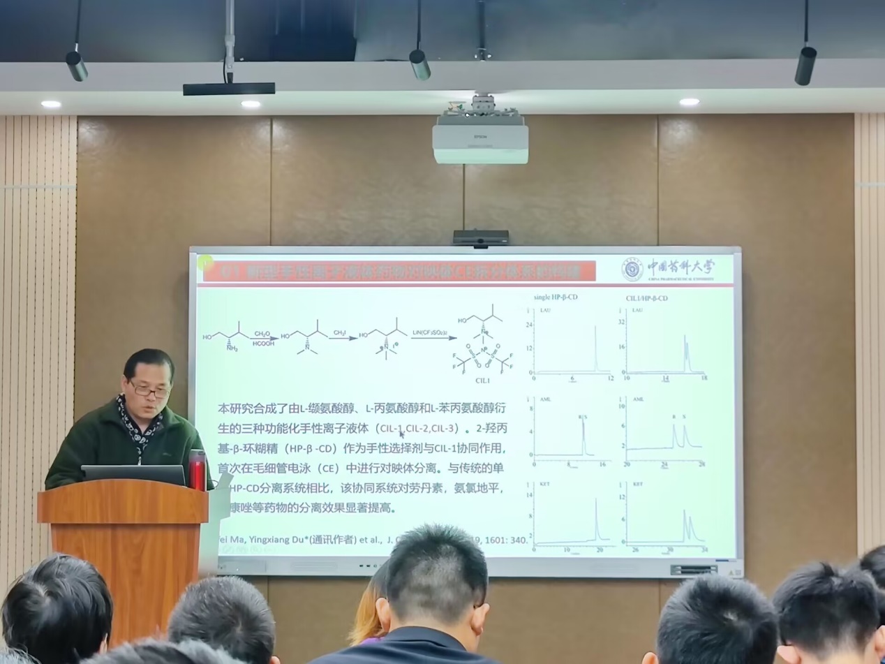 10月19日晚,孟目的学院在书院举办第九期药缘科普报告会,活动特邀我校药物分析学教授、博士生导师杜迎翔,作题为“手性离子液体、手性功能化纳米材料药物对映体毛细管电泳拆分新体系和分子印迹纳米材料荧光传感器的构建”的精彩报告。