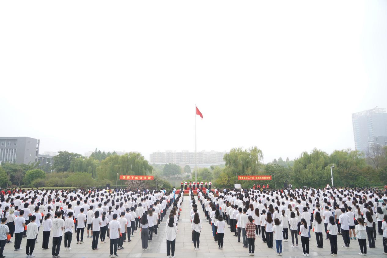 10月1日,由校团委主办、外国语学院承办的世界杯直播“国旗下的公开课”第二十六次集体课程暨“青春喜迎二十大,强国有我新征程”庆祝中华人民共和国成立73周年升国旗仪式在江宁校区1936广场举行。校党委书记金能明,校长郝海平,校党委副书记、纪委书记戴建君,校党委副书记、副校长王正华,校党委常委、宣传部部长陈卫忠出席仪式。相关职能部门负责人、各学院领导、教师和辅导员代表以及来自各学院的800余名学生代表参加仪式。仪式由外国语学院党委书记付蕾主持。
