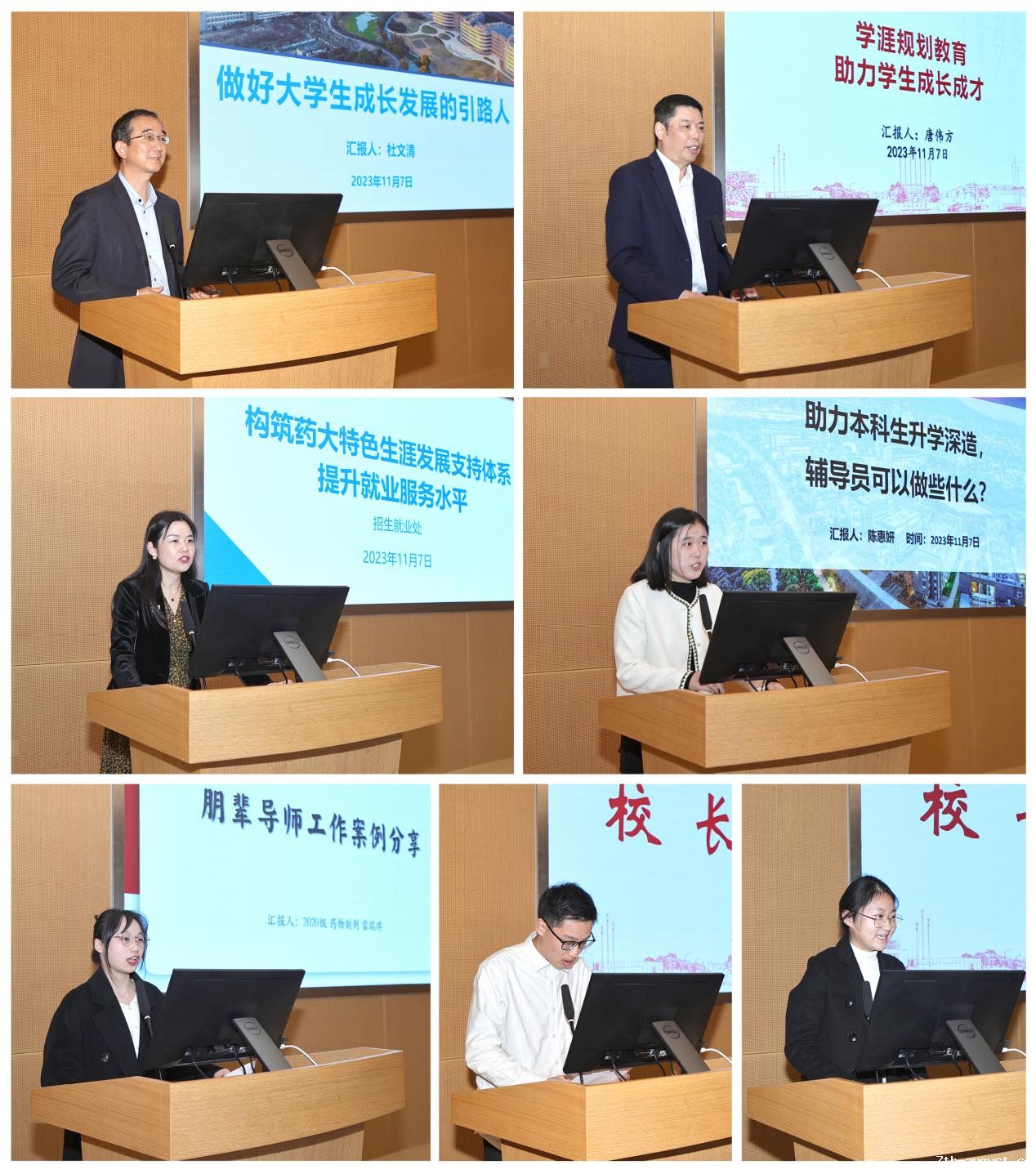 会上,学工处处长杜文清、教务处处长唐伟方、招生就业处处长刘燕莉分别以“做好大学生成长发展的引路人”“学涯规划教育,助力学生成长成才”“构筑药大特色生涯发展支持体系,提升就业服务水平”为主题汇报了学校学涯规划教育工作开展情况,并对工作中存在的问题、难点以及未来的工作方向作了简要汇报。生命科学与技术学院辅导员陈惠妍以“助力本科生考研深造,辅导员可以做些什么?”为主题汇报了工作中的优秀经验;药学院药物制剂专业雷瑞琪,药学院胡语宸、国际医药商学院王梦琪分别作为朋辈导师代表和新生代表发言。校领导们认真听取了汇报,现场与同学们进行了热烈的互动交流。