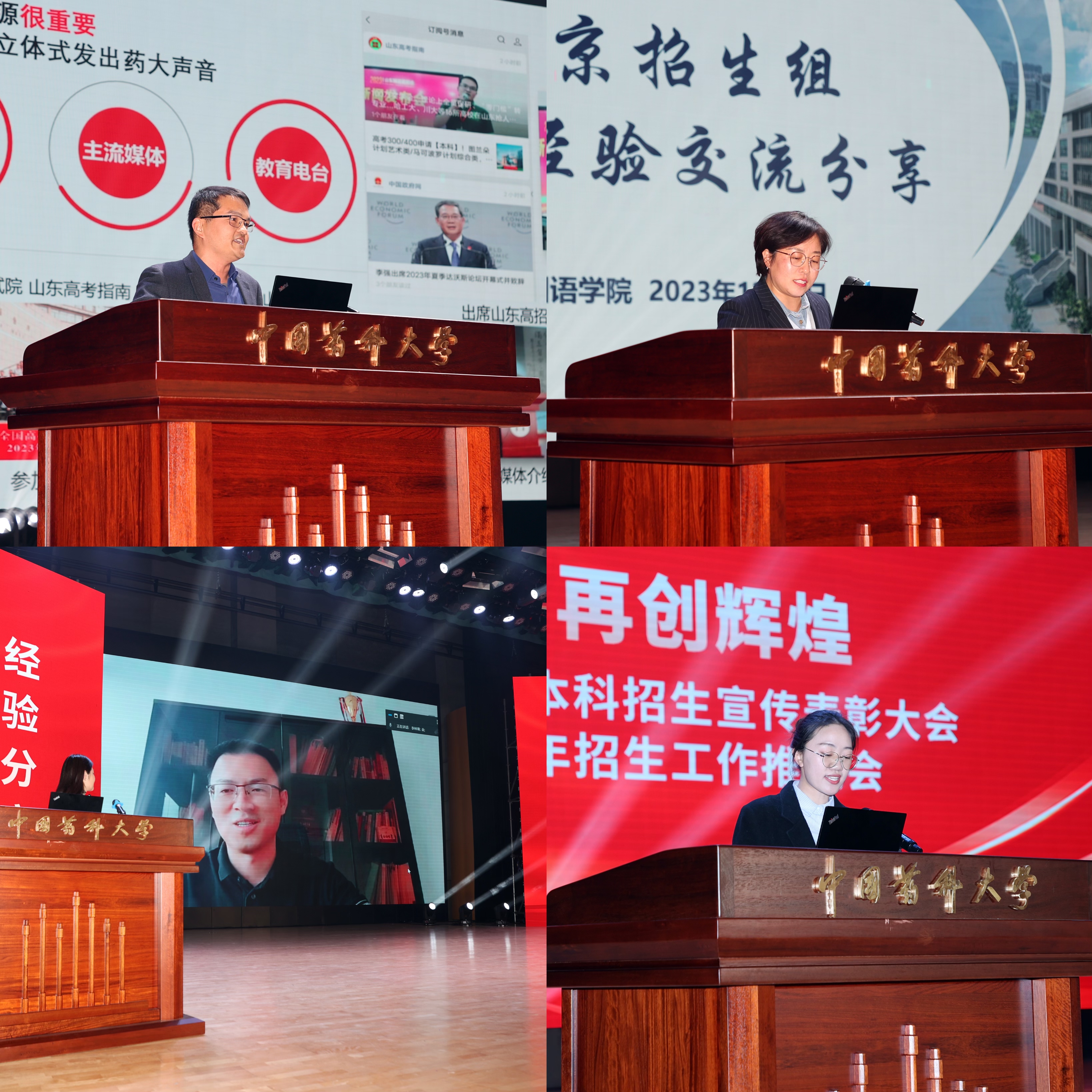 经验分享环节,山东招生组组长韩守兴、南京招生组组长付蕾分别作为本科招生宣传先进集体和先进组长代表发言。他们从本年度招生宣传工作取得的成绩,招生宣传工作的亮点、难点、创新点以及下一阶段的目标和思路等方面作经验交流。国际医药商学院研究生李高洁作为招生宣传学生志愿者代表发言,她结合自己的实践经历及个人收获,鼓励同学们积极参与寒暑假高中母校回访活动以及高招驻点期间宣传活动,为中国药大招生贡献青春力量。