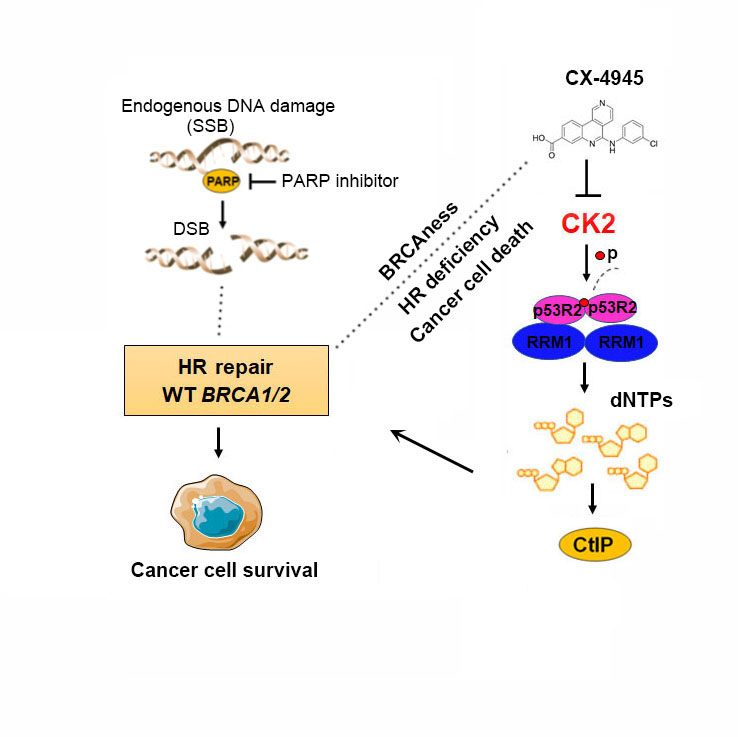 然而,携带BRCA1/2突变在卵巢癌或乳腺癌患者不到30%,大部分BRCA1/2野生型的卵巢癌患者对PARP抑制剂不敏感。陈果教授团队首次报道,核糖核苷酸还原酶小亚基p53R2在肿瘤中高表达,并可通过调控CtIP稳定性影响同源重组修复本研究进一步发现,酪蛋白激酶II (CK2)通过磷酸化p53R2 (Ser20)位点促进核糖核苷酸还原酶的组装活性发挥从而保证同源重组修复所需的dNTPs原料供给因此,靶向CK2可通过抑制BRCA1/2野生型肿瘤细胞同源重组修复因子CtIP表达及dNTPs原料合成,增强BRCA1/2野生型肿瘤细胞对PARP抑制剂的敏感性。综上所述,研究揭示了一种抑制同源重组修复的新途径,为PARP抑制剂BRCA1/2野生型癌症患者治疗中的应用提供了一种新的策略。