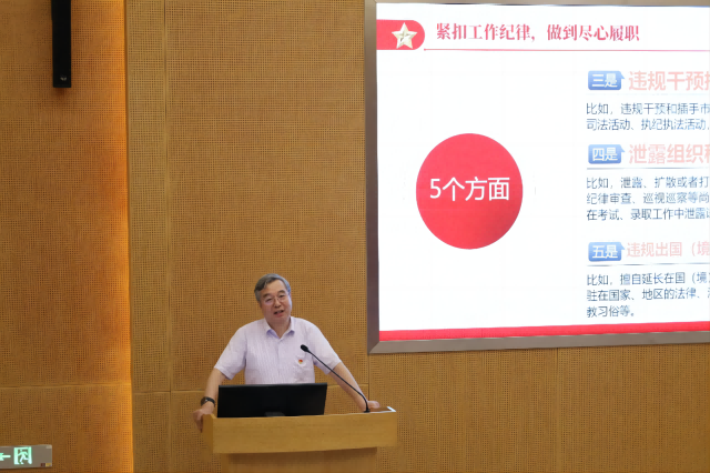 6月19日下午,副校长孔令义在江宁校区经管文楼111报告厅为国际医药商学院作《紧扣“六大纪律”,推动党纪学习教育走深走实》的专题党课。国际医药商学院教职工党员参加学习。