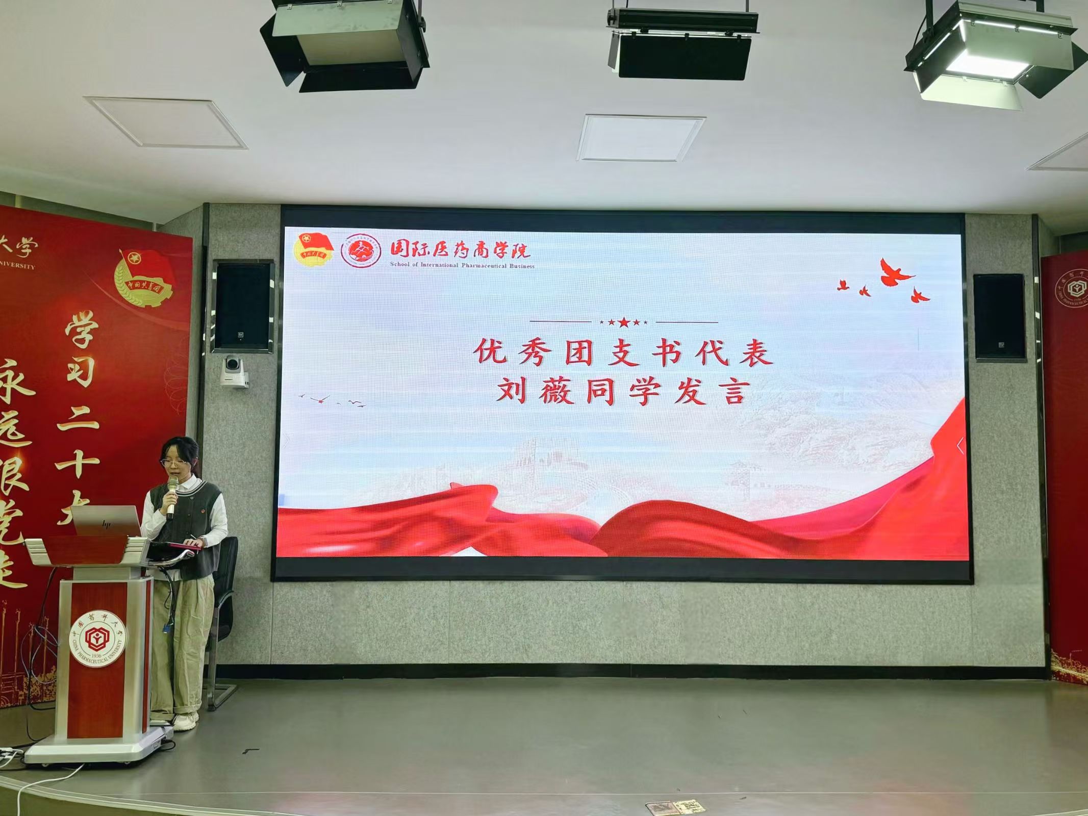 优秀团支书代表刘薇同学在发言中分享了她担任班级团支书的深刻体会和工作心得,呼吁同学们作为“商青”精英,要悟行相长、思行并进,在担当中历练,在尽责中成长,在新时代的广阔天地中施展抱负、顽强拼搏,努力成长为堪当民族复兴重任的时代新人。
